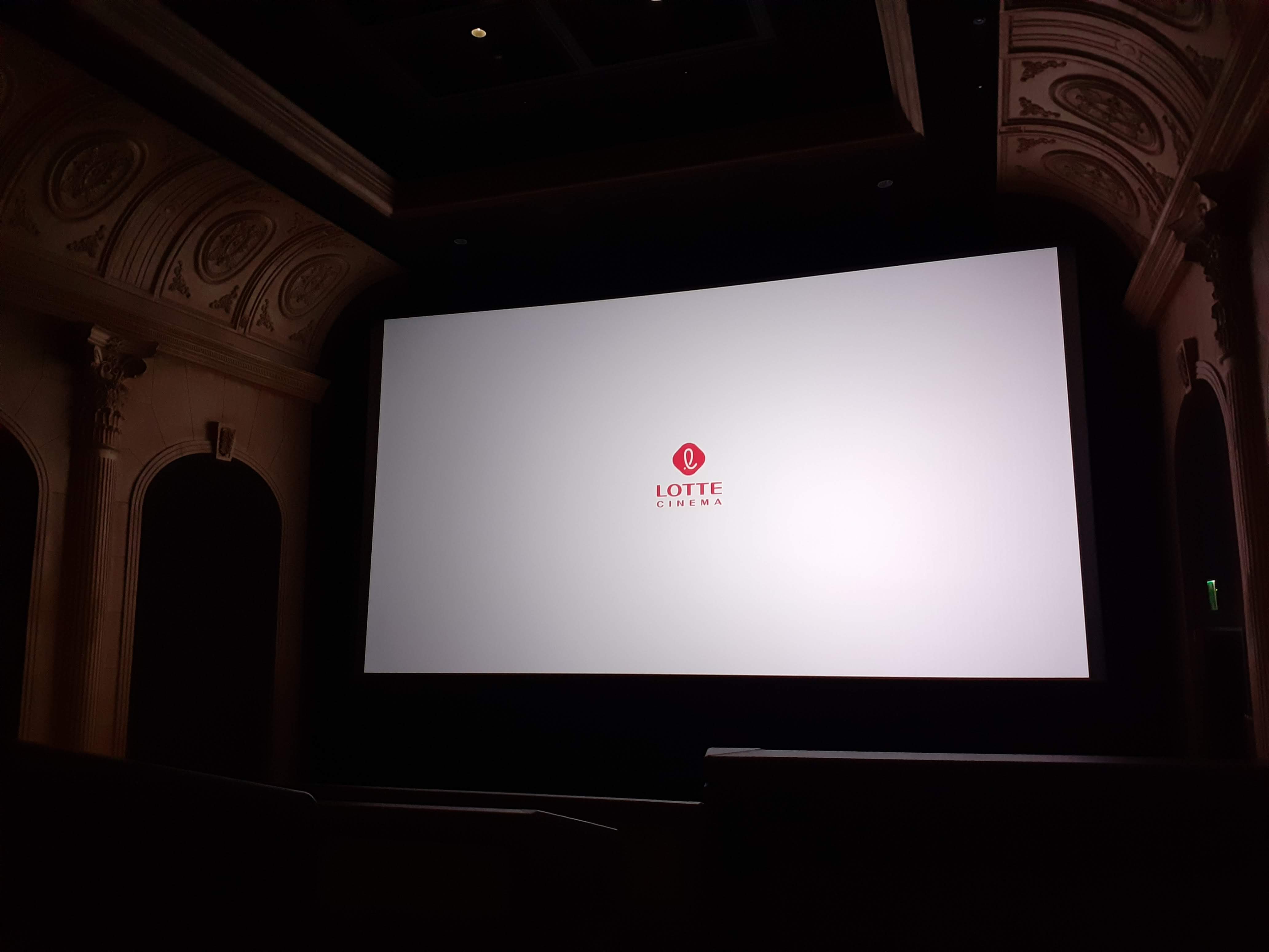 영화 시작 전 광고 시간에 잠시 담아본 측면 인테리어입니다. 유럽풍의 인테리어로 꾸며져 있어 고급스러운 느낌을 자랑합니다. 예전부터 롯데는 유럽풍의 인테리어를 좋아한다고 생각했는데, 여기에서도 그 점을 느낄 수 있었습니다.