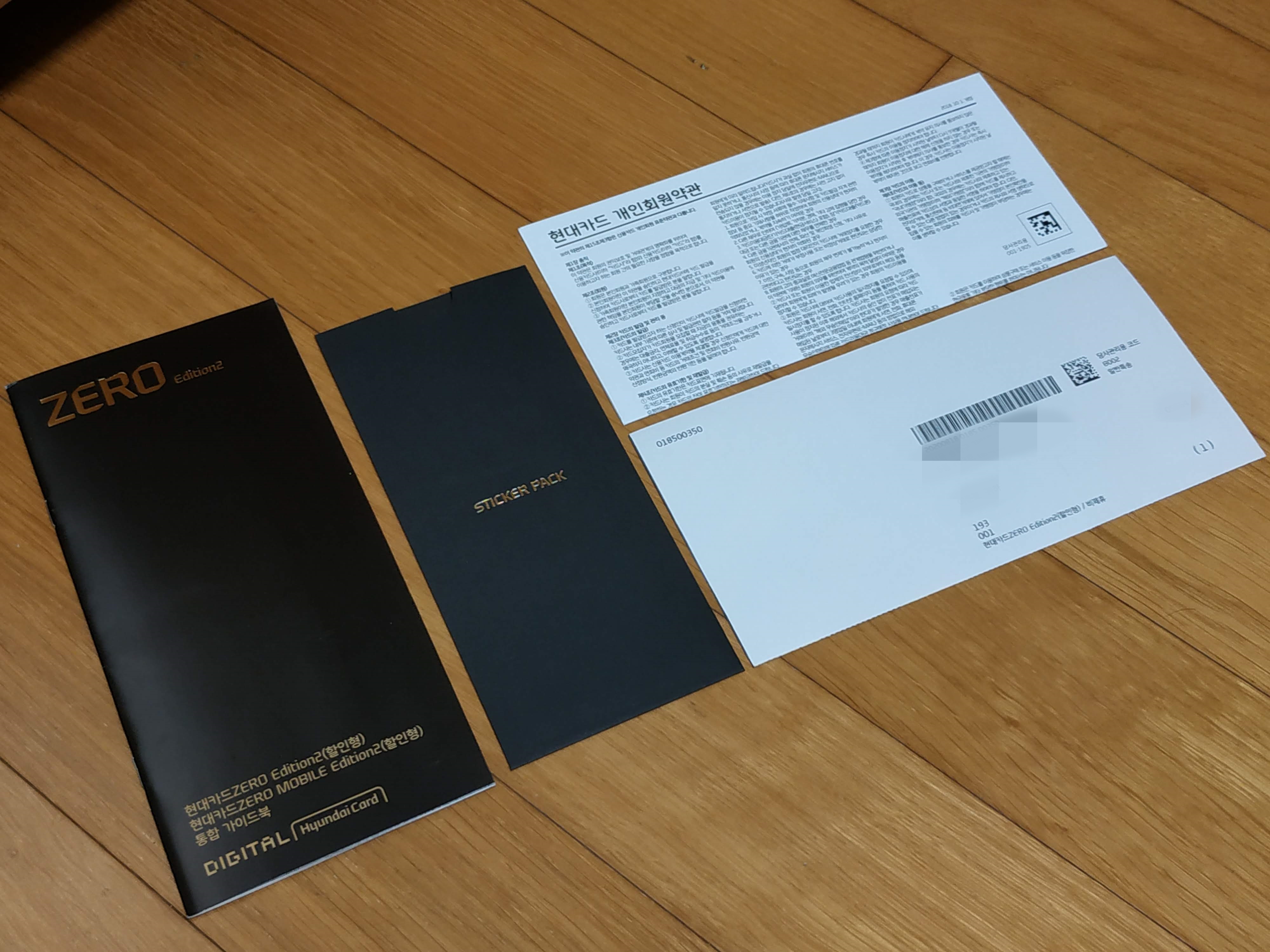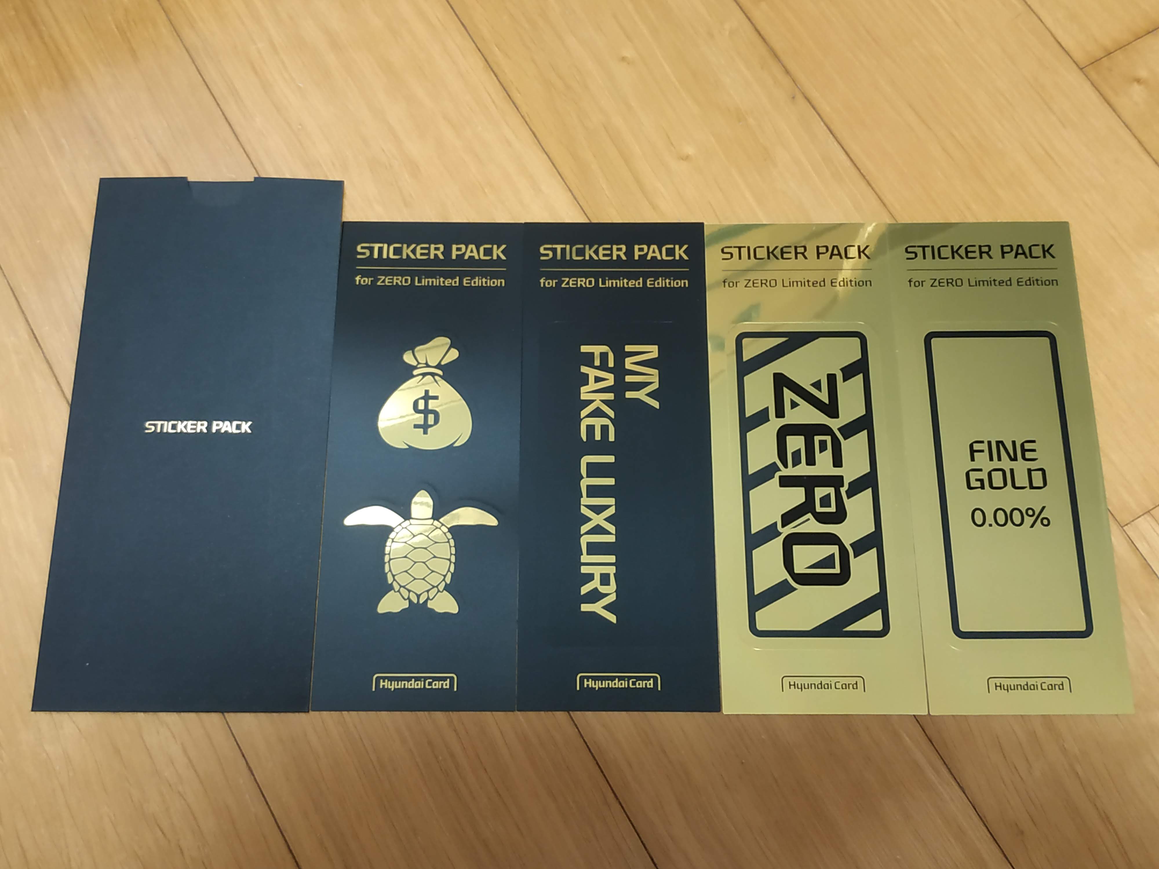 제로카드 에디션2 한정판의 구성은 여타 카드와 크게 다르지 않습니다. 카드 설명서, 개인회원약관, 그리고 실물 카드가 들어있는 종이까지는 흔히 보던 건데 한 가지 못 보던 게 들어있습니다. 바로 스티커 팩입니다.