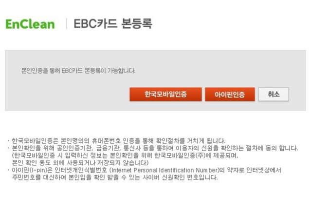 카드 번호를 정확하게 입력하면 다음 단계인 EBC카드 본등록으로 넘어가게 됩니다. 사실 처음에는 EBC카드가 뭐지? 했었는데 다시 생각해보니 <EnClean Bonus Card>의 약자입니다. 이 글을 보시는 분들은 처음부터 아셨을 수도 있지만 아무튼 갑자기 지칭하는 용어를 바꿔버리는 건 수정해야 할 필요가 있다고 생각합니다. 카드 본등록은 본인인증을 통해 가능하며 본인인증 수단은 한국모바일인증(휴대폰번호) 또는 아이핀인증 중에서 선택 가능합니다.
