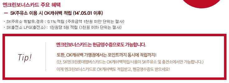 앞서 말씀드렸다시피 엔크린 보너스카드는 SK주유소 이용 시 OK캐쉬백이 적립됩니다. 유종에 따라 적립률이 다른데 휘발유, 경유는 0.1% 적립되며 주유금액 1천 원 미만 단위는 절사 된다고 합니다. SK충전소 이용 시 LPG는 1 천원당 5원이 적립되며 주유금액 1천 원 이하 단위는 절사 된다고 합니다.
