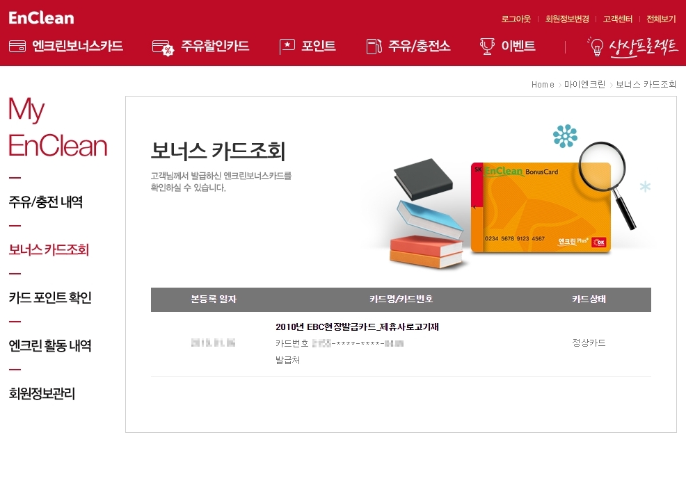 카드 등록이 완료되면 [엔크린 홈페이지] - [마이페이지] - [보너스 카드조회] 페이지에서 소유 중인 카드의 본등록 일자, 카드명/카드번호, 카드상태 등을 확인할 수 있습니다. 이외에 주유/충전 내역, 카드 포인트 확인, 엔크린 활동 내역, 회원정보관리도 여기서 가능하므로 잘 알아두시면 편리합니다.