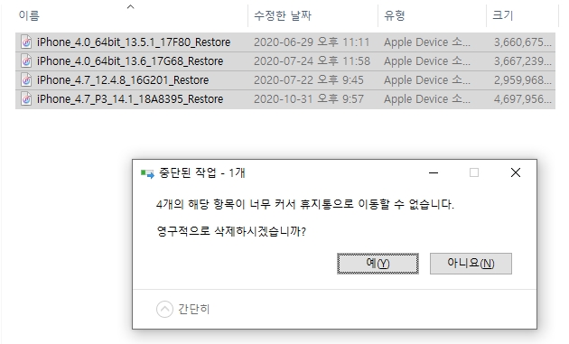 이해를 돕기 위해 임의로 하나의 파일을 선택하여 속성을 살펴보았습니다. 우선 파일 형식은 Apple Device 소프트웨어 업데이트 파일입니다. 그리고 용량은 무려 4.47GB입니다. 비유하자면 어지간한 고화질 영화 파일 한 개 정도의 용량을 차지한다는 뜻입니다.