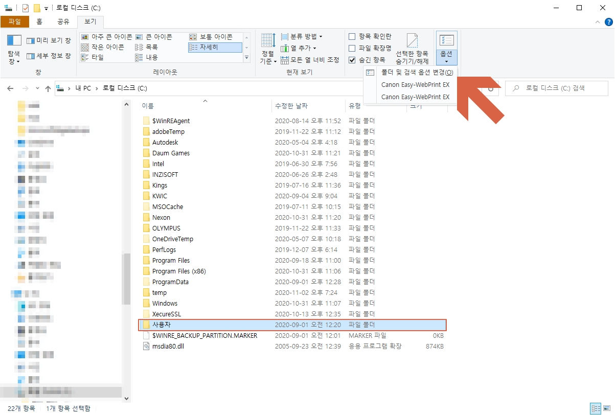 아이폰 업데이트 파일을 찾기에 앞서 해야할 작업이 하나 있습니다. 바로 윈도우 탐색기에서 숨겨진 폴더를 표시하는 기능인데요. 아이폰 업데이트 파일이 평소에는 숨김 폴더에 저장되어 있기 때문입니다. 해당 설정을 위해 우선 탐색기에서 로컬디스크(C:) - 보기 - 옵션 - 폴더 및 검색 옵션 변경을 열어주시기 바랍니다.