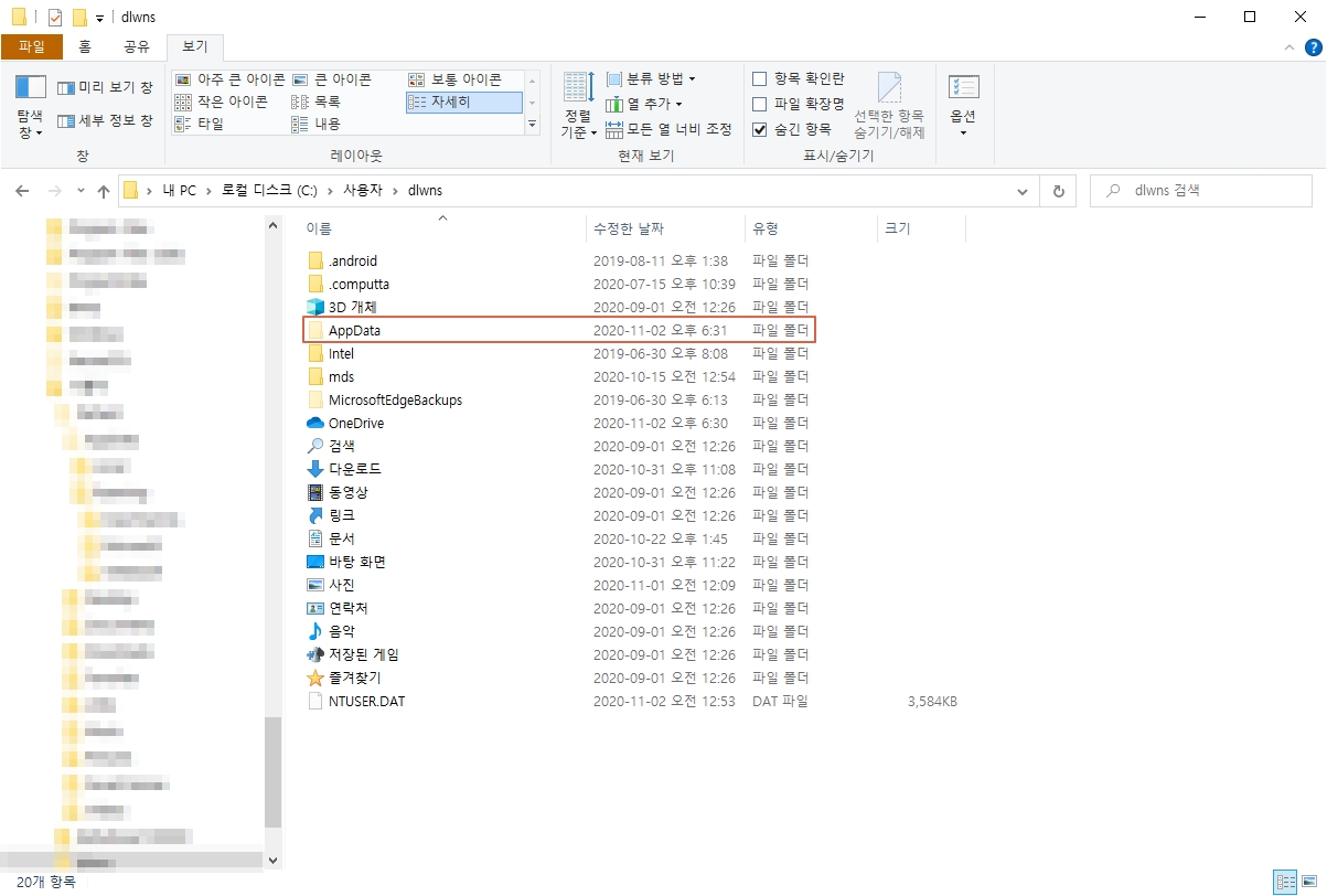 먼저 윈도우 탐색기에서 내 PC > 로컬 디스크 (C:) [또는 자신의 컴퓨터 주 하드디스크] > 사용자 > PC 사용자 폴더(각 컴퓨터마다 이름은 다를 수 있음)로 들어가시면 숨겨져 있던 [ AppData ] 폴더가 보입니다.