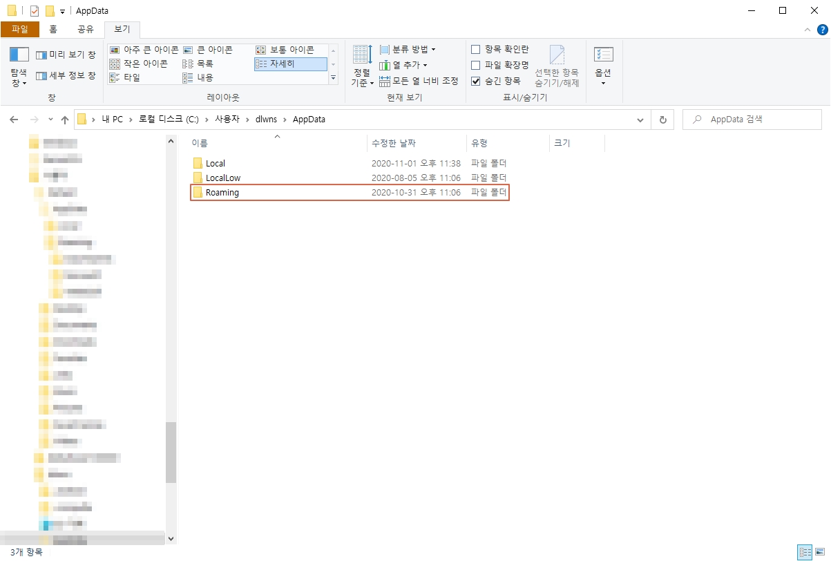 AppData 폴더 내에 또 다른 폴더들이 나타나는데, 이 중에서 [ Roaming ] 폴더로 들어갑니다.