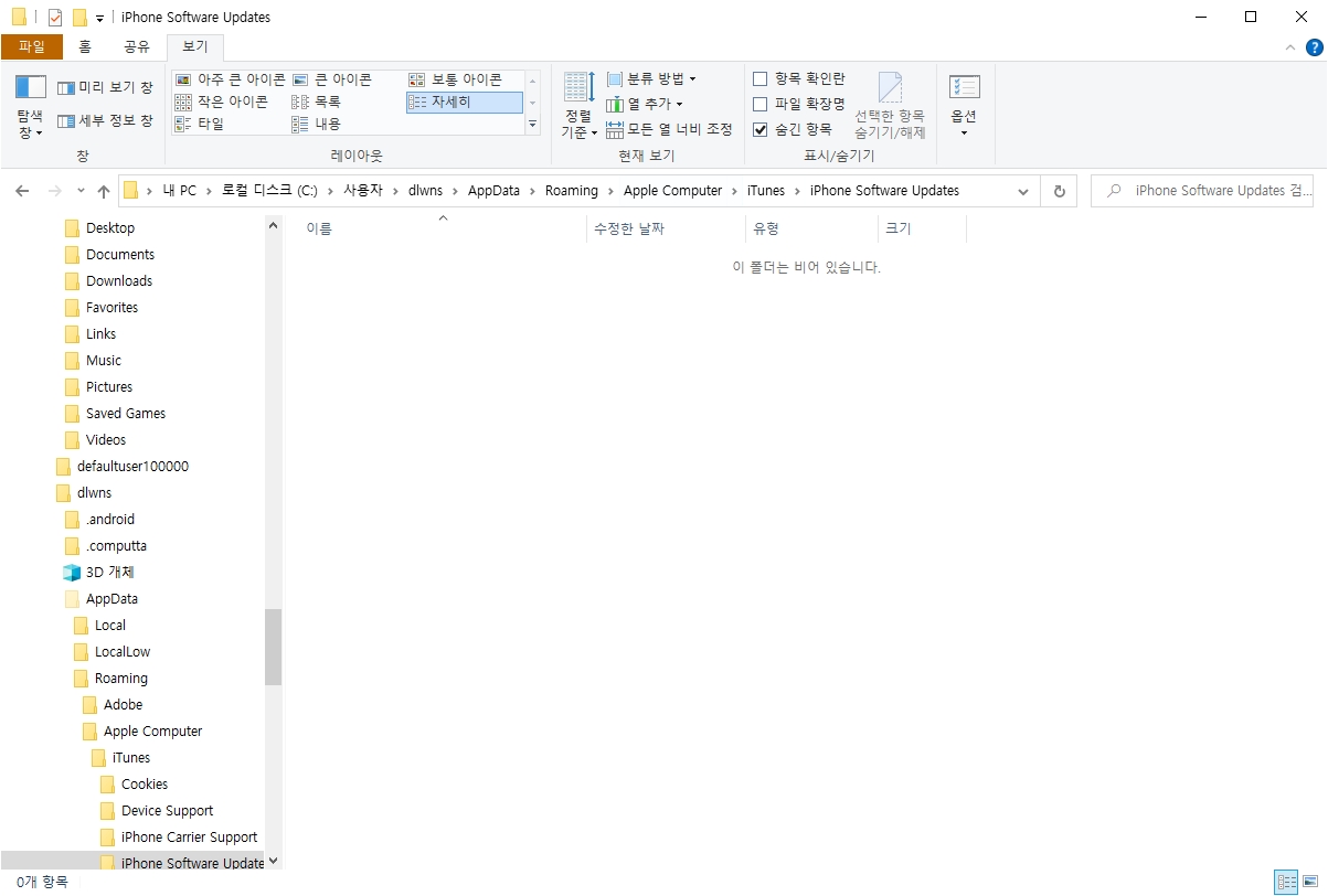 윈도우 폴더 옵션을 변경하여 아이폰 업데이트 파일 위치 보이게 하기