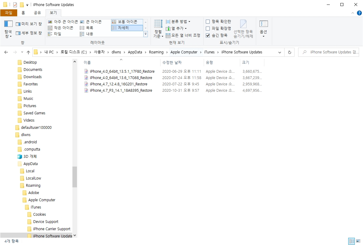내 PC > 로컬 디스크 (C:) > 사용자 > (사용자 폴더) > AppData > Roaming > Apple Computer > iTunes > iPhone software updates