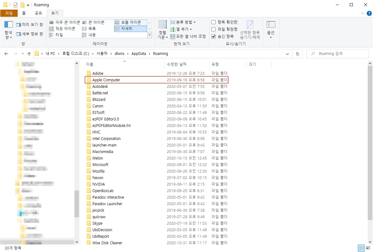 Roaming 폴더에도 마찬가지로 수많은 하위 폴더가 있습니다. 이 중에서 우리에게 익숙한 그 이름, [ Apple Computer ] 로 들어가시면 됩니다.
