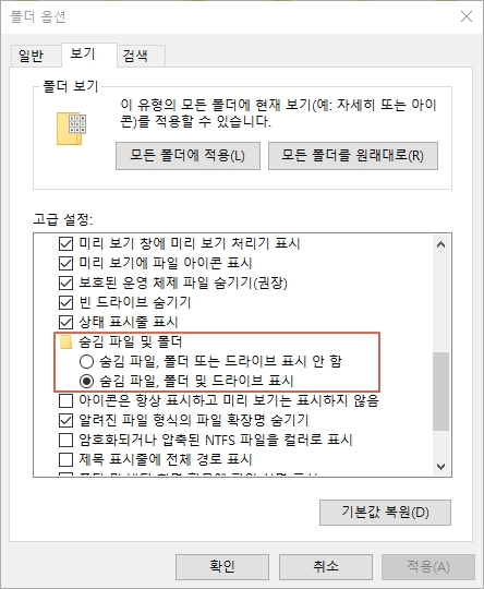 폴더 옵션 - 보기를 누르시면 하단에 고급 설정이 나옵니다. 중간쯤 내리다보면 숨김 파일 및 폴더라는 설정 항목이 있는데 [숨김 파일, 폴더 및 드라이브 표시]로 변경해주시면 됩니다.