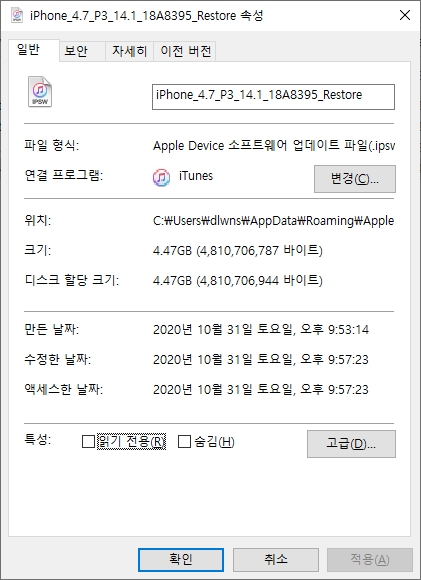 이해를 돕기 위해 임의로 하나의 파일을 선택하여 속성을 살펴보았습니다. 우선 파일 형식은 Apple Device 소프트웨어 업데이트 파일입니다. 그리고 용량은 무려 4.47GB입니다. 비유하자면 어지간한 고화질 영화 파일 한 개 정도의 용량을 차지한다는 뜻입니다.