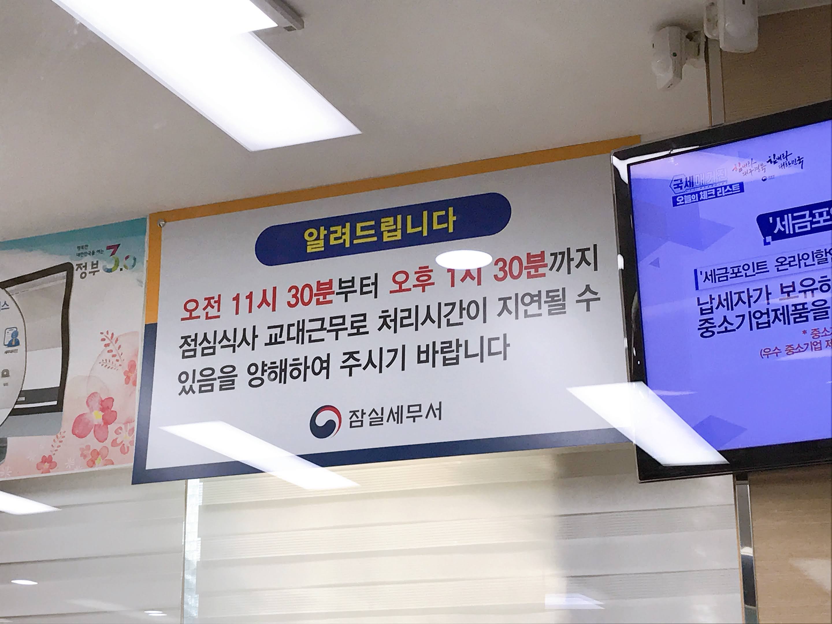 제가 방문한 곳은 잠실세무서입니다. 이 곳 특징은 송파세무서와 장소를 공유하기 때문에 주차가 어렵고, 아산병원 옆에 있어 시간대를 잘못 맞추면 굉장히 진출입이 어렵다는 점입니다. 대신 따로 주차료는 받지 않기 때문에 차량으로 방문하실 분들은 오전 11시 전 또는 오후 3시 이후 방문을 추천합니다.