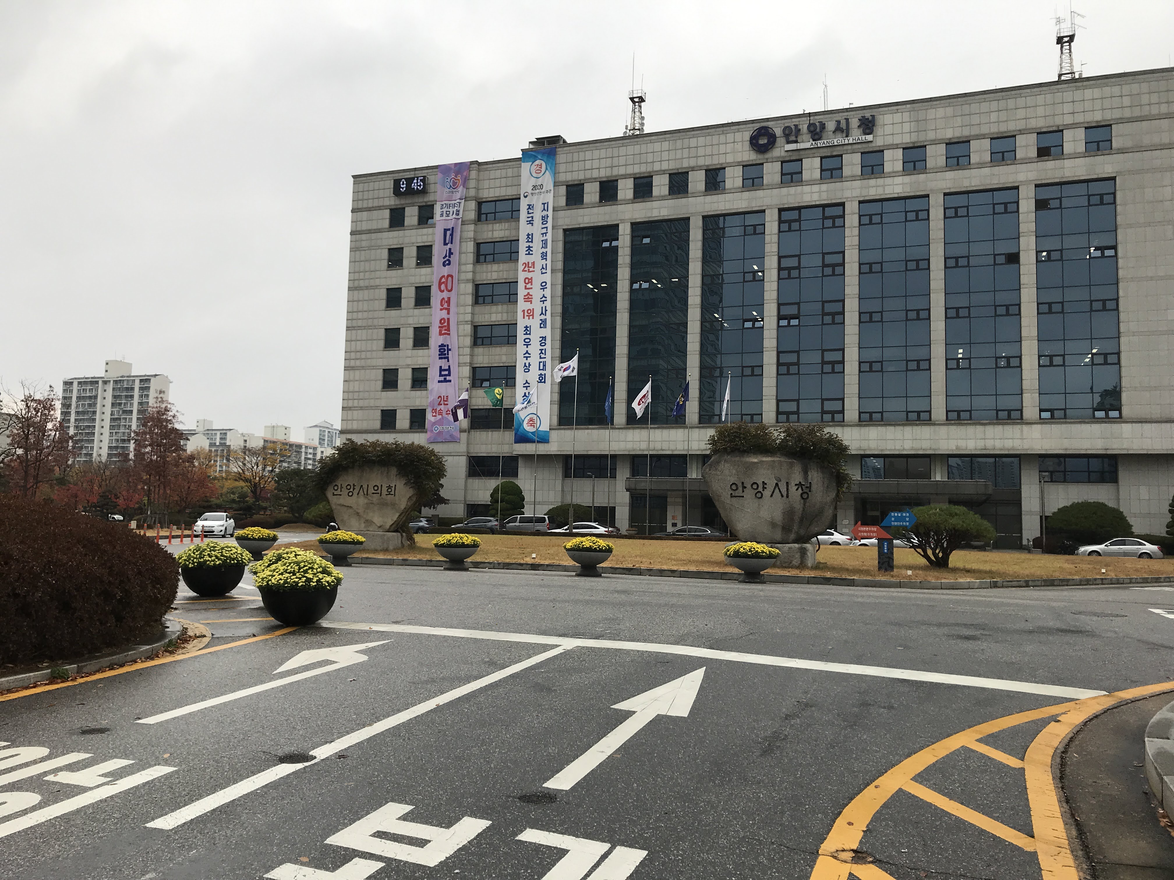 안양시청은 멀리는 평촌역과 범계역 사이에 위치하고 있습니다. 근처에 지식산업센터, 사무실은 물론이고 주거단지도 크게 조성되어 있어 항상 유동인구가 많은 곳 중 하나입니다. 시청 주변은 넓은 대로가 바둑판 모양으로 배치되어 있고 그 너머로 평촌인라인스케이트장과 평촌중앙공원으로 이어진 녹지공간이 자리 잡고 있어서 계획도시의 면모 또한 보여주고 있습니다.