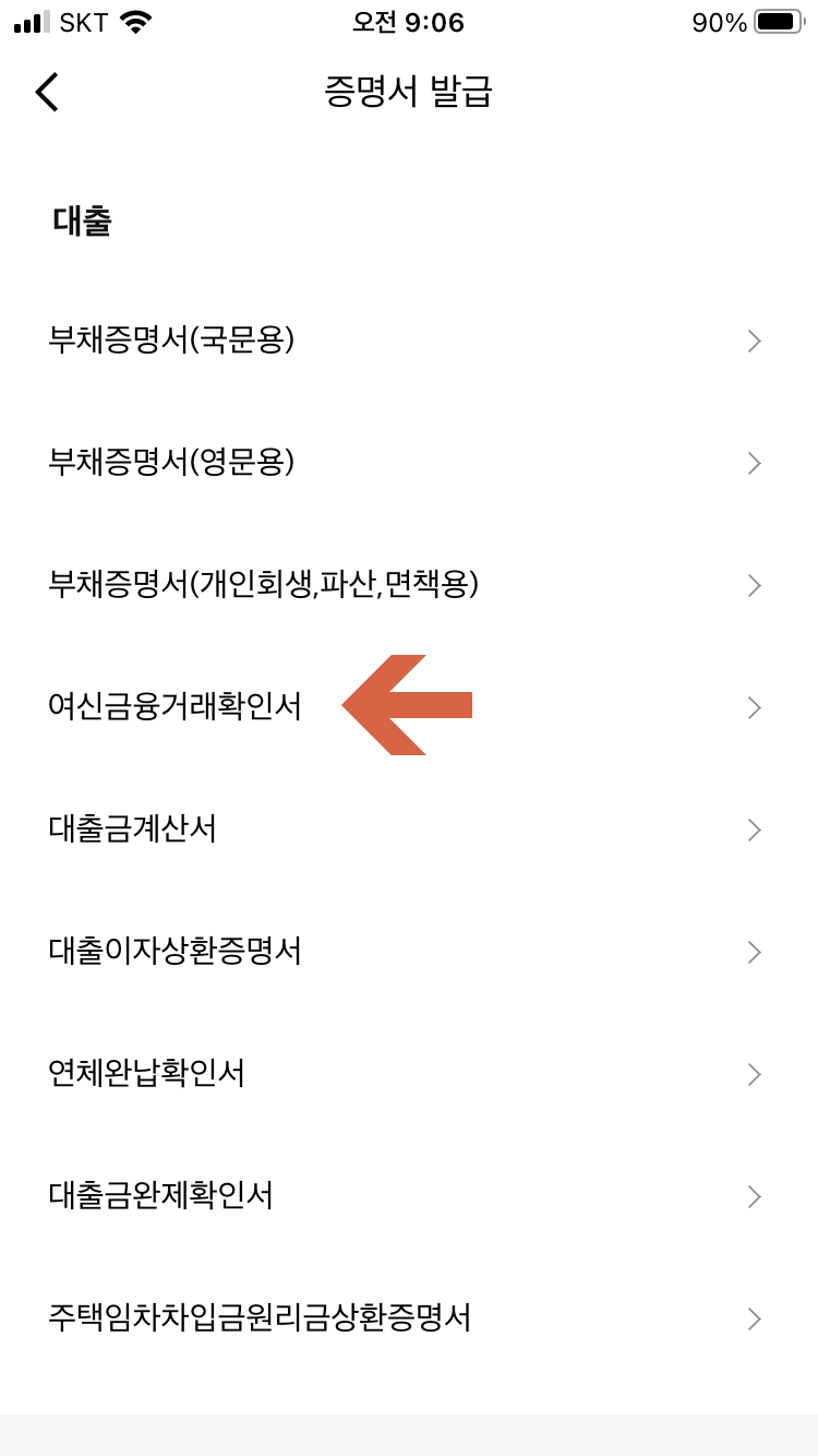 2) 고객센터 메뉴 중 고객지원 - 증명서 발급 > 대출 > 여신금융거래확인서 순으로 선택합니다.