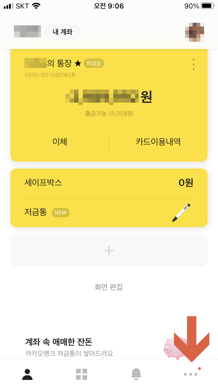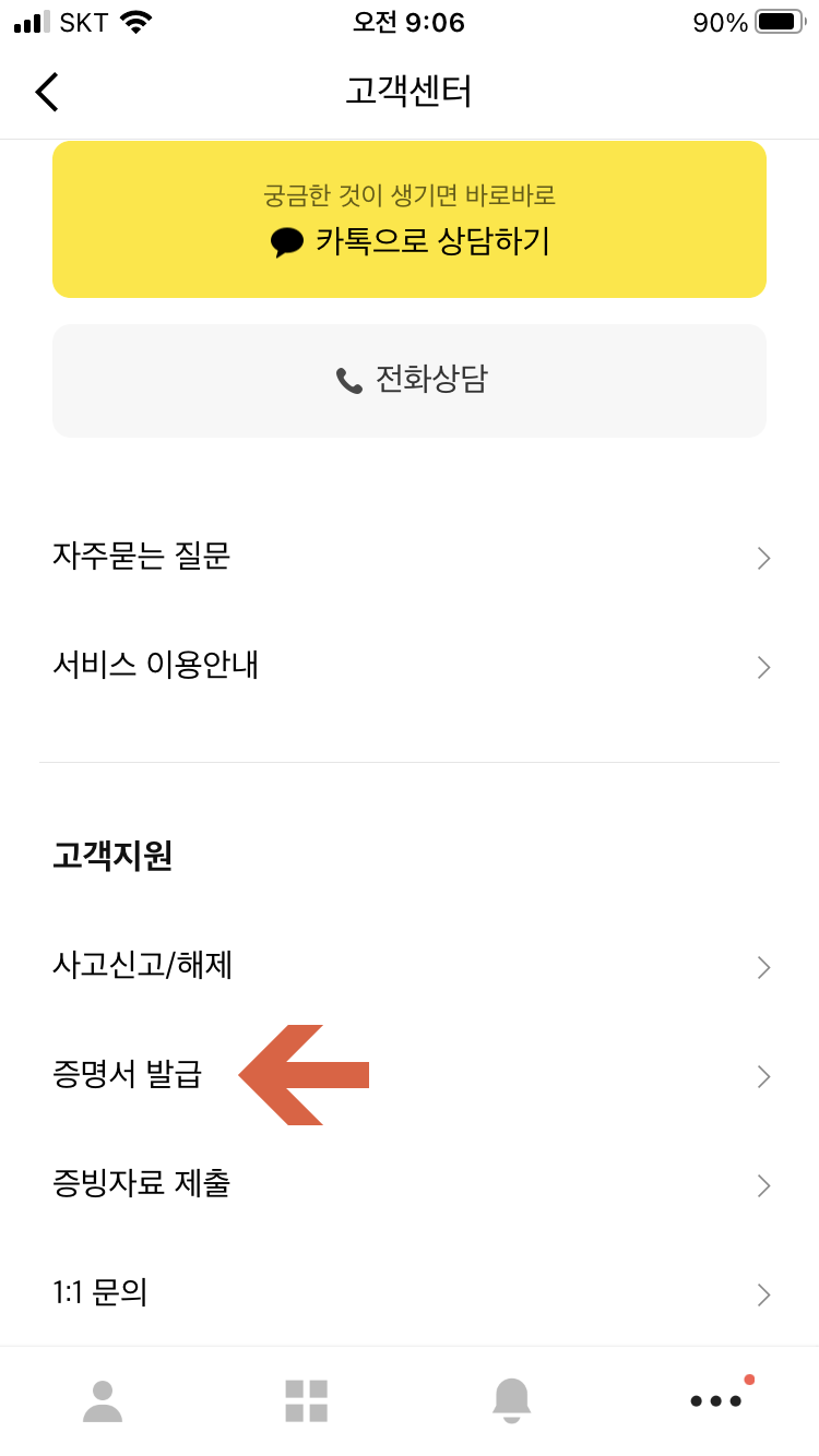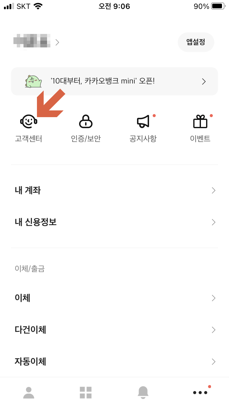 1) 가장 먼저 카카오뱅크 앱에서 더보기 버튼(···) > 고객센터를 선택합니다.