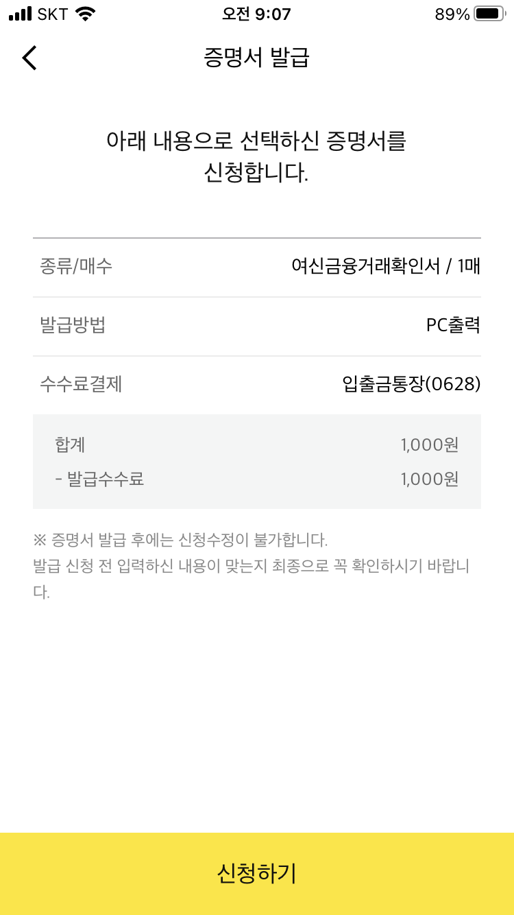 5) 증명서 발급 종류/매수, 발급방법, 수수료결제 내용을 다시 한 번 확인한 다음, 카카오뱅크 인증 비밀번호를 입력하면 증명서 신청이 완료됩니다.