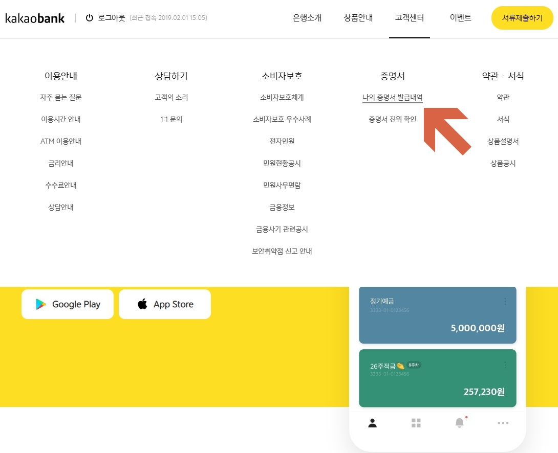 1) PC에서 카카오뱅크 홈페이지에 접속하여 로그인을 완료한 다음, 증명서 - 나의 증명서 발급내역을 클릭합니다.