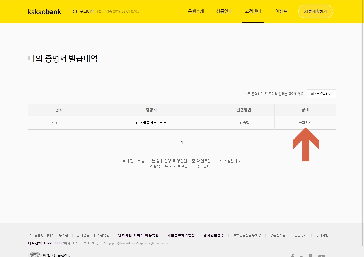 이제 여신금융거래확인서 발급 신청을 완료하였으니 제출하기 위한 PC출력 방법에 대해 알려드리겠습니다.