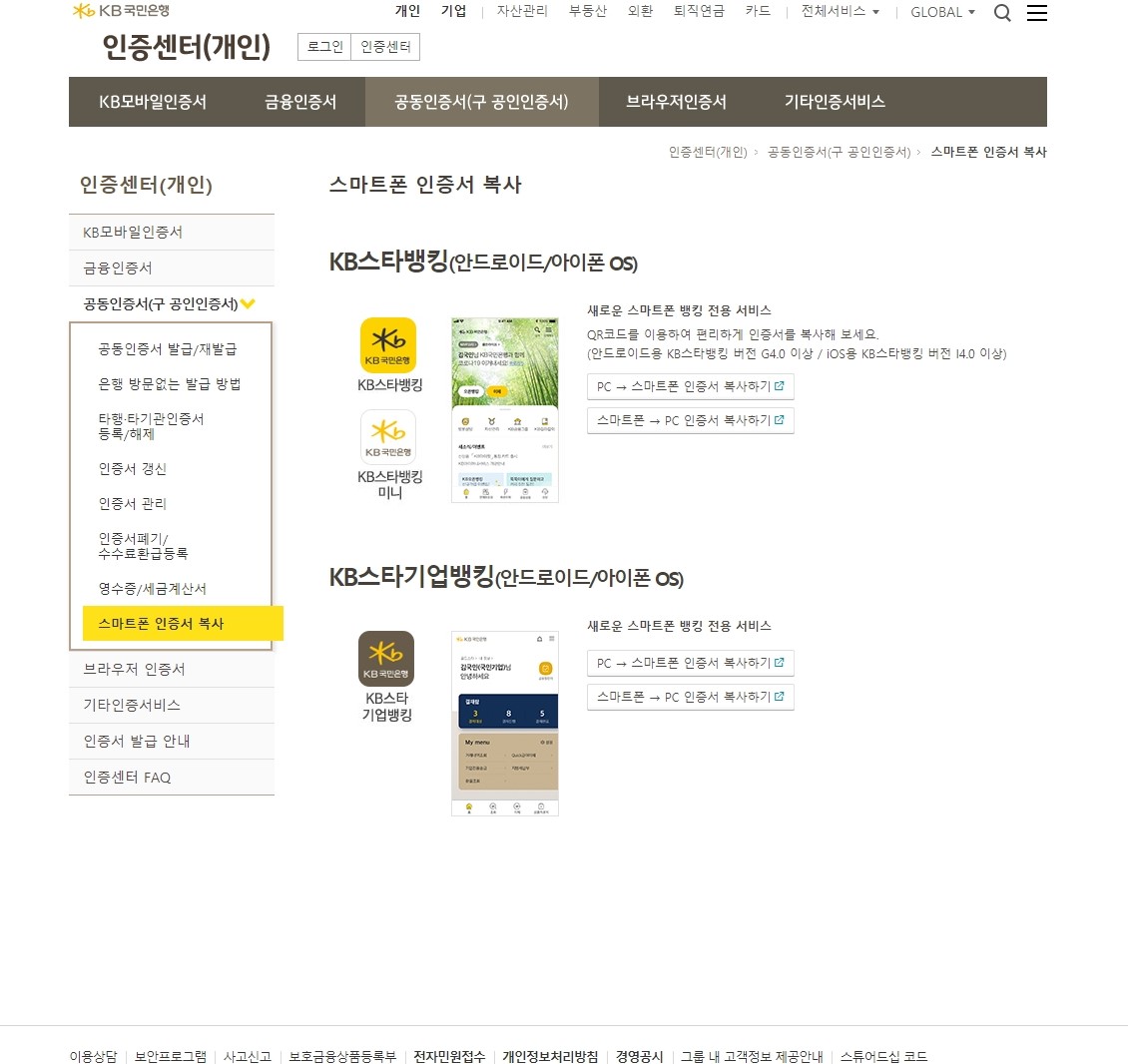 먼저 인증센터(개인) > 공동인증서(구 공인인증서) > 스마트폰 인증서 복사 순으로 들어갑니다. 그다음 개인 고객은 KB스타뱅킹, 기업 고객은 KB스타기업뱅킹 앱을 선택해야 하는데, 헷갈리시면 아이콘과 썸네일(작은 그림)을 참고하시면 됩니다. 저는 개인 고객이므로 KB스타뱅킹 옆에 있는 PC -> 스마트폰 인증서 복사하기를 클릭합니다. 참고로 스마트폰에서 먼저 공동인증서를 갱신한 경우, 아래에 있는 스마트폰 -> PC 인증서 복사하기 버튼을 눌러서 진행하시면 됩니다.