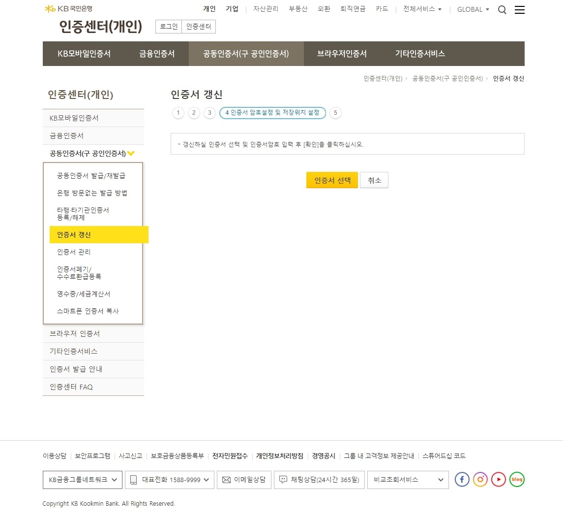 국민은행 인증센터(개인) 상단 메뉴에서 공동인증서(구 공인인증서) > 인증서 갱신 순으로 선택합니다.