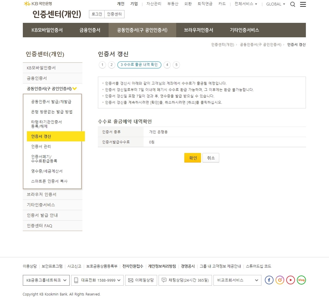 다음은 수수료 확인입니다. 개인 은행용 공동인증서의 경우 따로 수수료를 받지 않으므로 인증서 발급 수수료 = 0원입니다. 확인을 누르면 다음으로 넘어갑니다.