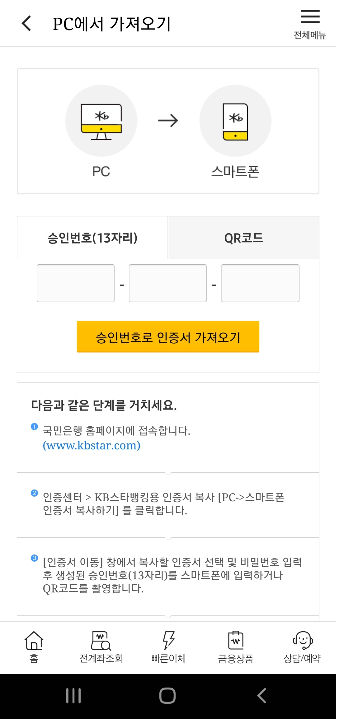 PC에서 가져오기 메뉴를 선택하면 PC에서 스마트폰으로 공동인증서를 가져오기 위한 두 가지 인증방법이 있습니다. 먼저 승인번호(13자리)는 앞서 PC 인증서 복사 화면에서 보았던 13자리의 숫자를 입력하면 됩니다. QR코드는 PC 인증서 복사 화면에 생성된 QR코드를 스마트폰으로 촬영하여 인증하는 방식으로 승인번호 입력보다 더 쉽고 간편하게 인증이 가능합니다. 두 가지 방법 중 하나를 선택하여 입력하면 PC에서 갱신한 공동인증서를 스마트폰으로 복사하는 과정이 마무리됩니다.