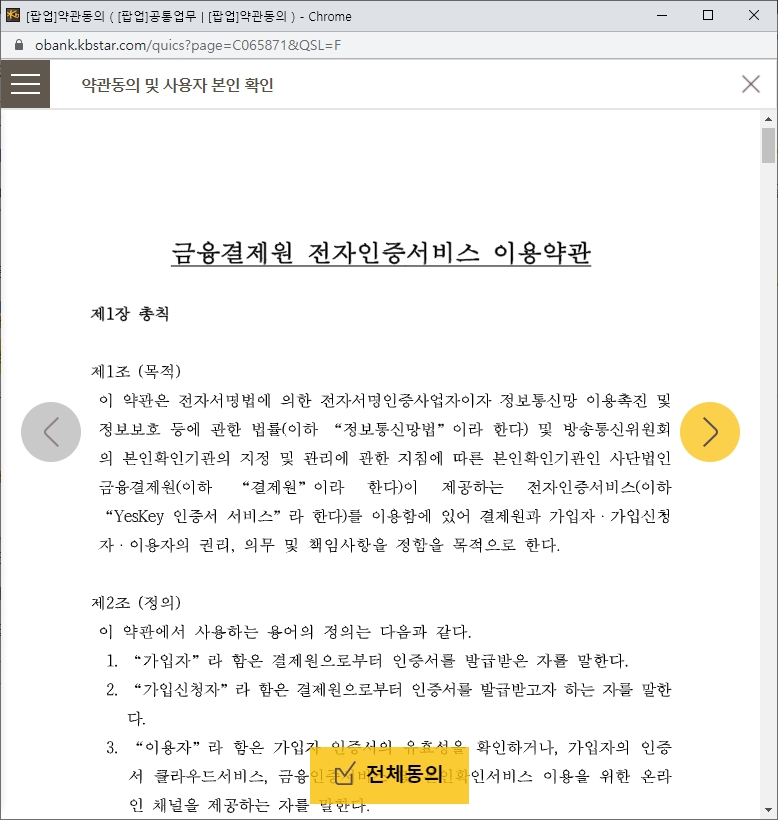 갱신하고자 하는 공동인증서 로그인이 완료되면 본격적인 갱신 절차에 들어갑니다. 먼저 공동인증서 갱신에 따르는 약관을 확인하고 동의하는 과정입니다. 인증서 갱신을 위해 필수적으로 동의해야 하는 사항들이므로 한 번쯤 읽어보시고 전체동의 해주시면 됩니다.