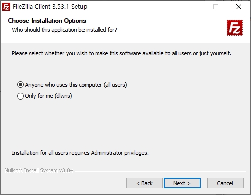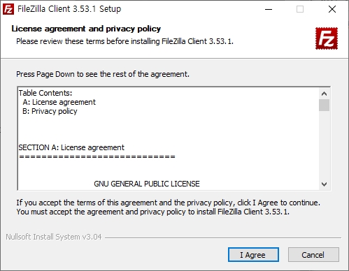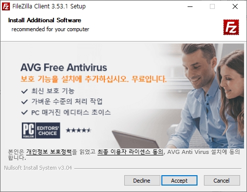 파일질라 설치는 일반적인 프로그램들과 크게 다르지 않습니다. 다만 중간에 AVG Free Antivirus 프로그램 설치를 유도하는데, 사용에 큰 불편함이 없는 무료 버전을 설치하는 중으므로 이 정도는 충분히 이해할 수 있습니다.