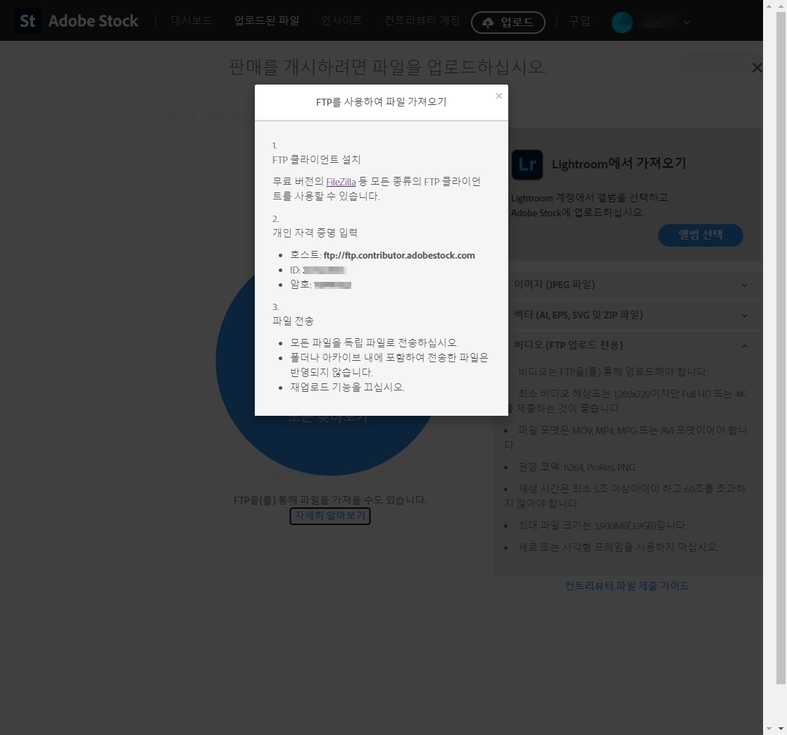 어도비스톡에 파일질라로 대용량 파일 올리기