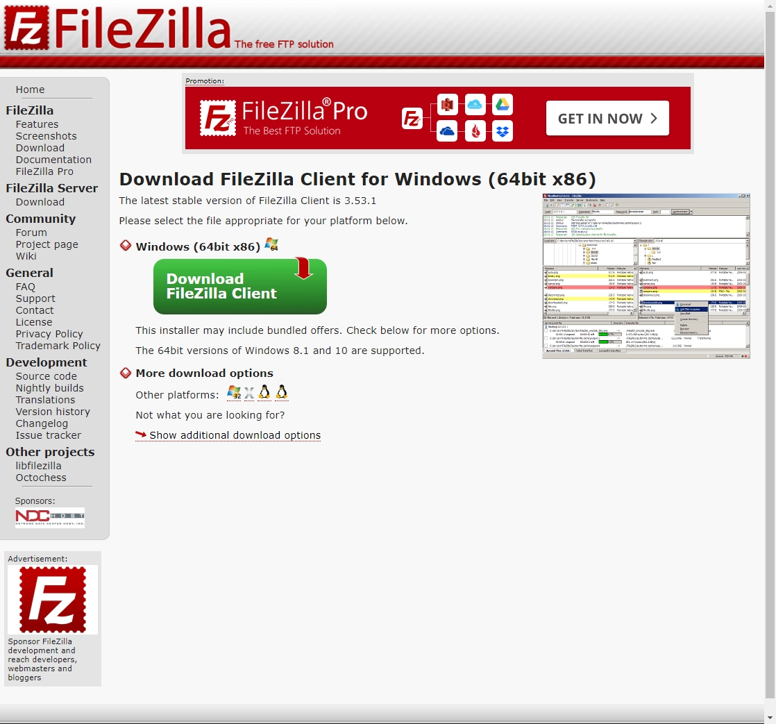 링크를 클릭하면 파일질라 다운로드 페이지로 접속합니다. 사용 중인 OS에 맞는 페이지로 자동 접속되기 때문에 굳이 사용 중인 운영체제를 선택할 필요가 없어서 편리합니다. Download FileZilla Client 버튼을 클릭하면 다음 단계로 넘어갑니다.