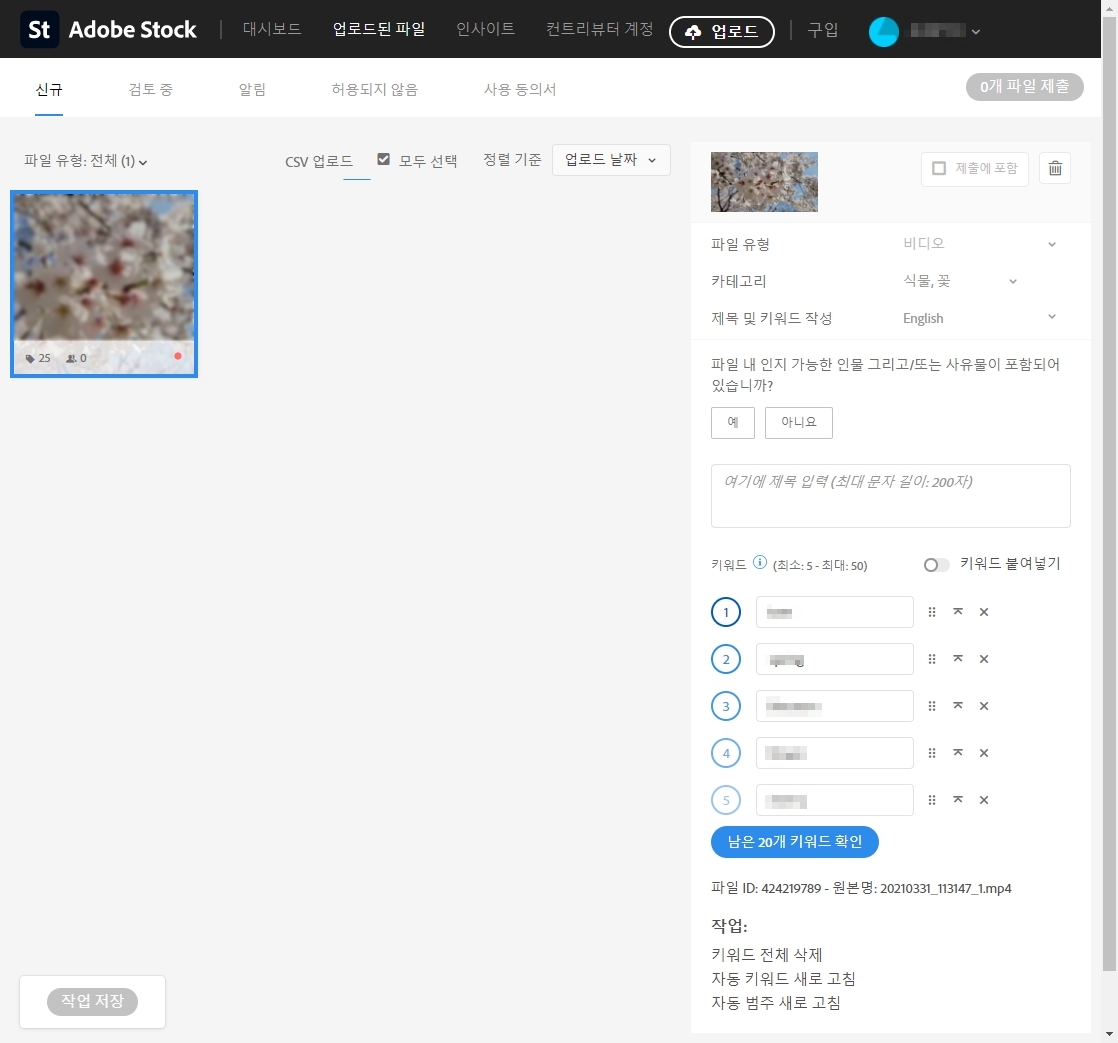 업로드 완료 후 어도비스톡의 업로드된 파일에 들어가보면 앞서 파일질라를 통해 올렸던 파일이 성공적으로 전송되었음을 확인할 수 있습니다. 이제 일반 파일 업로드와 마찬가지로 정보를 입력 후 최종 업로드 하시면 평가 후 정식으로 등록됩니다.