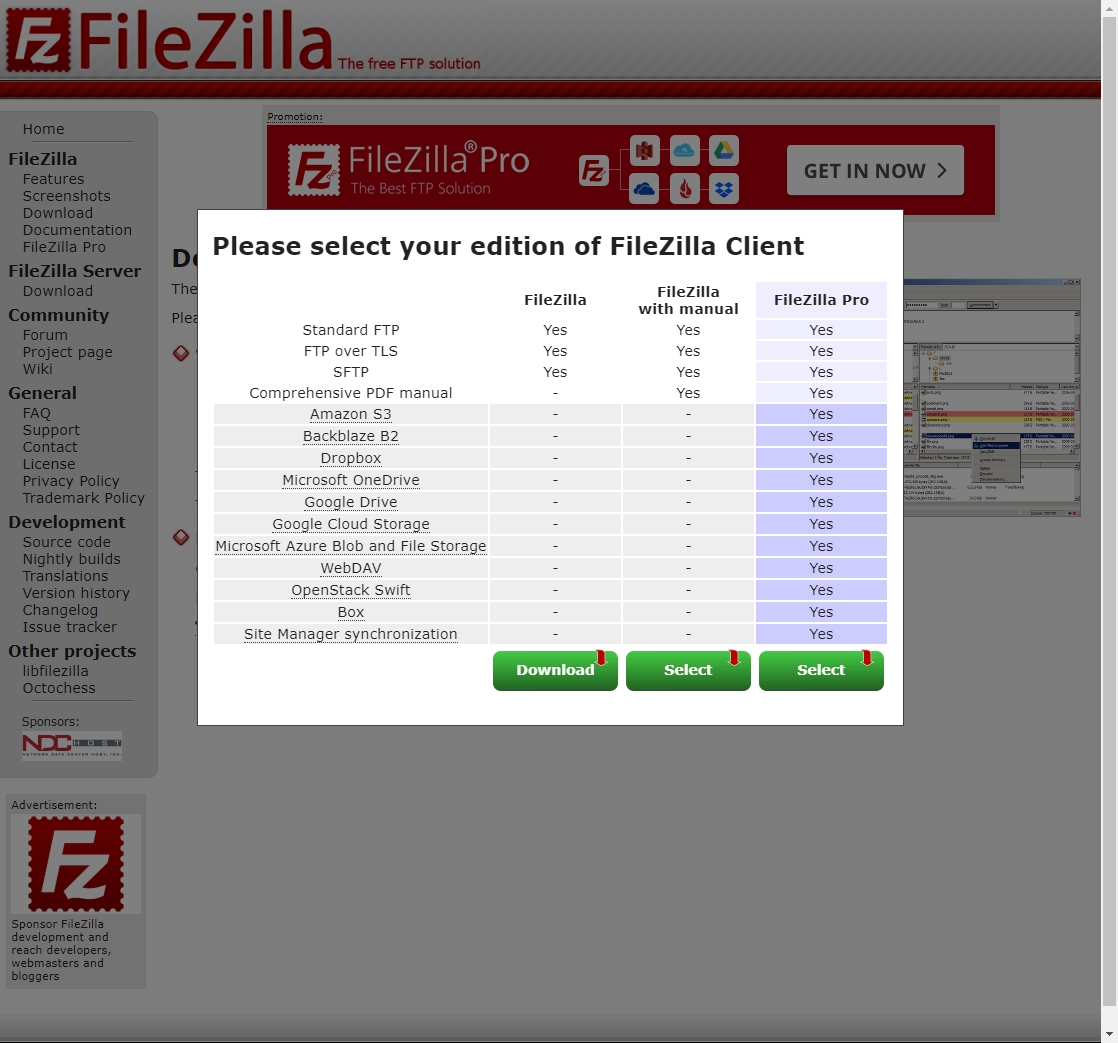 파일질라는 FileZilla / FileZilla with manual / FileZilla Pro 의 세 가지 버전이 있습니다. 상위 버전으로 갈수록 기능이 늘어나게 됩니다. 오늘 포스팅에서 사용하기엔 기본 버전으로도 충분하기 때문에 하단에 Download 버튼을 눌러 넘어갑니다.