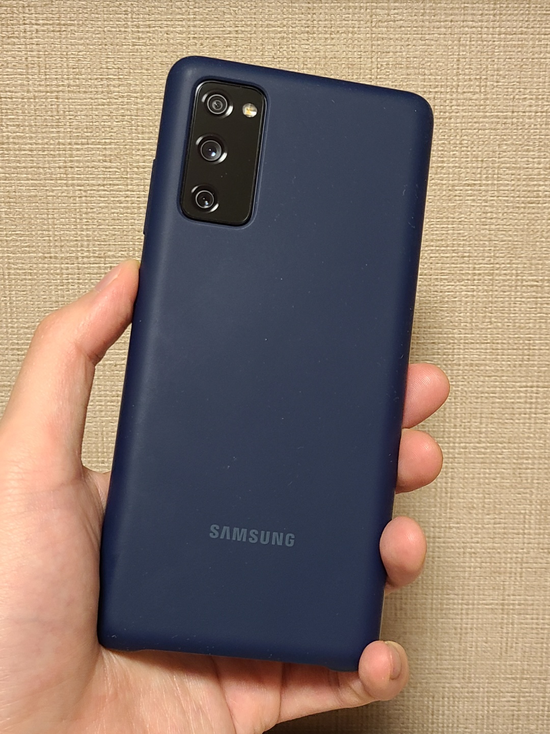 제품을 실제 장착한 모습입니다. 제가 쓰는 갤럭시 S20 FE는 클라우드 네이비 색상이라 같은 색으로 맞추기 위해 실리콘 케이스도 네이비로 구입했습니다. S20 FE의 가장 큰 특징은 무광택 마감 처리된 (삼성에서는 헤이즈 공법이라 부릅니다.) 후면이라 제품 자체도 반짝이는 느낌보다는 우아하고 고급스러운 마감을 추구한 느낌인데, 실리콘 케이스는 아예 반사되는 빛이 없기 때문에 한층 더 차분하고 단아한 느낌을 주고 있습니다. 앞서 제품 착용 전에도 확인했듯이 삼성 정품이기 때문에 제품과 한 치의 오차도 없이 딱 맞는 점도 이 제품이 가격에 비해 더 고급스럽게 보이는 역할을 합니다.