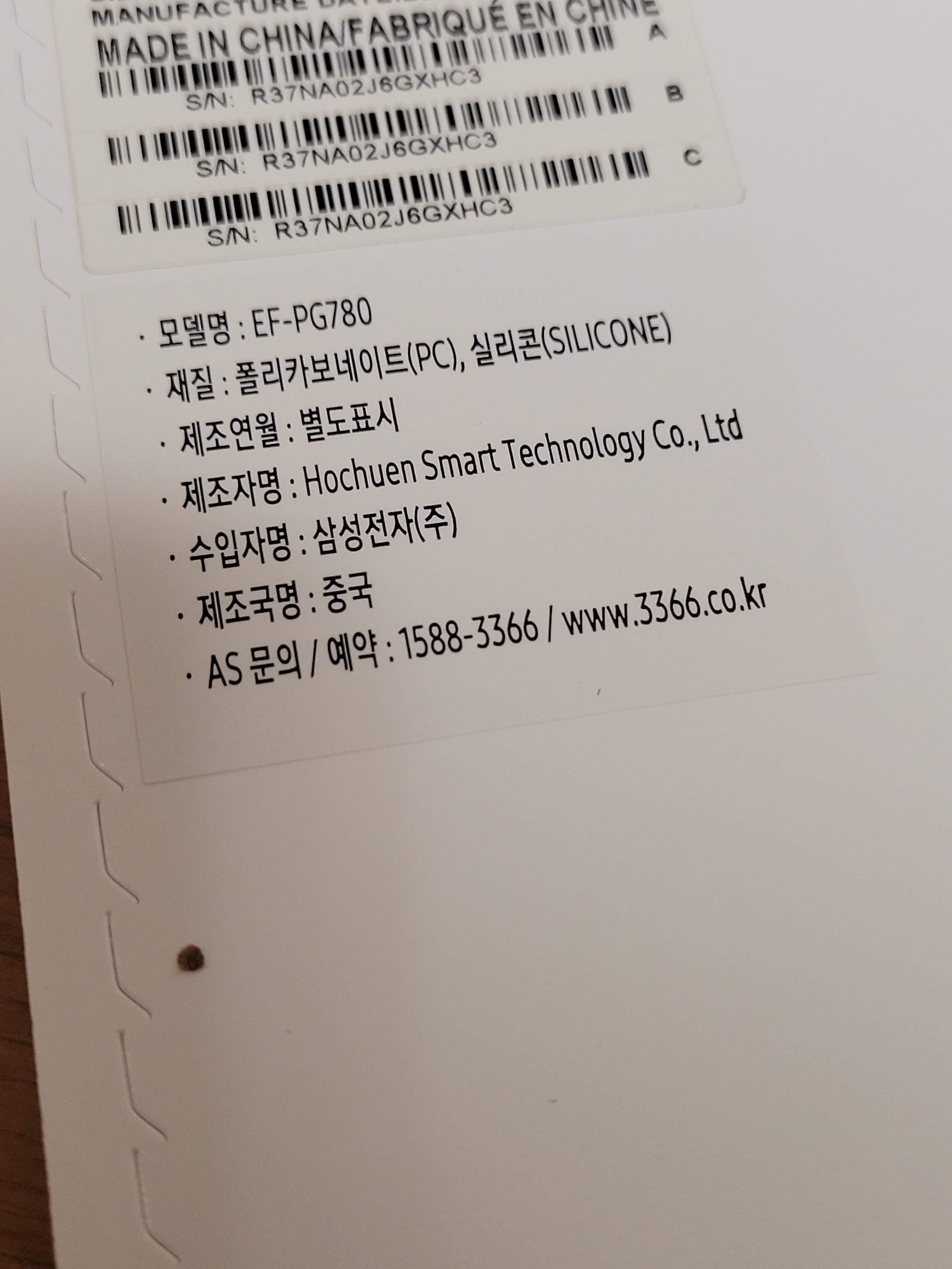 후면도 정면과 마찬가지로 깔끔하게 정리되어 있습니다. 종이로 된 후면 커버에는 제품 정보가 표기되어 있습니다. 모델명은 앞서 이 포스팅 제목에서 보셨다시피 EF-PG780입니다. 참고로 갤럭시 S20 FE 제품은 통신 대역별로 각각 SM-G780(LTE) / SM-G781(5G)로 명명되어 있습니다. 재질은 폴리카보네이트(PC)와 실리콘(SILICONE) 합성입니다. 제조국은 중국입니다. 정품 케이스답게 AS문의도 친절하게 기재되어 있습니다.
