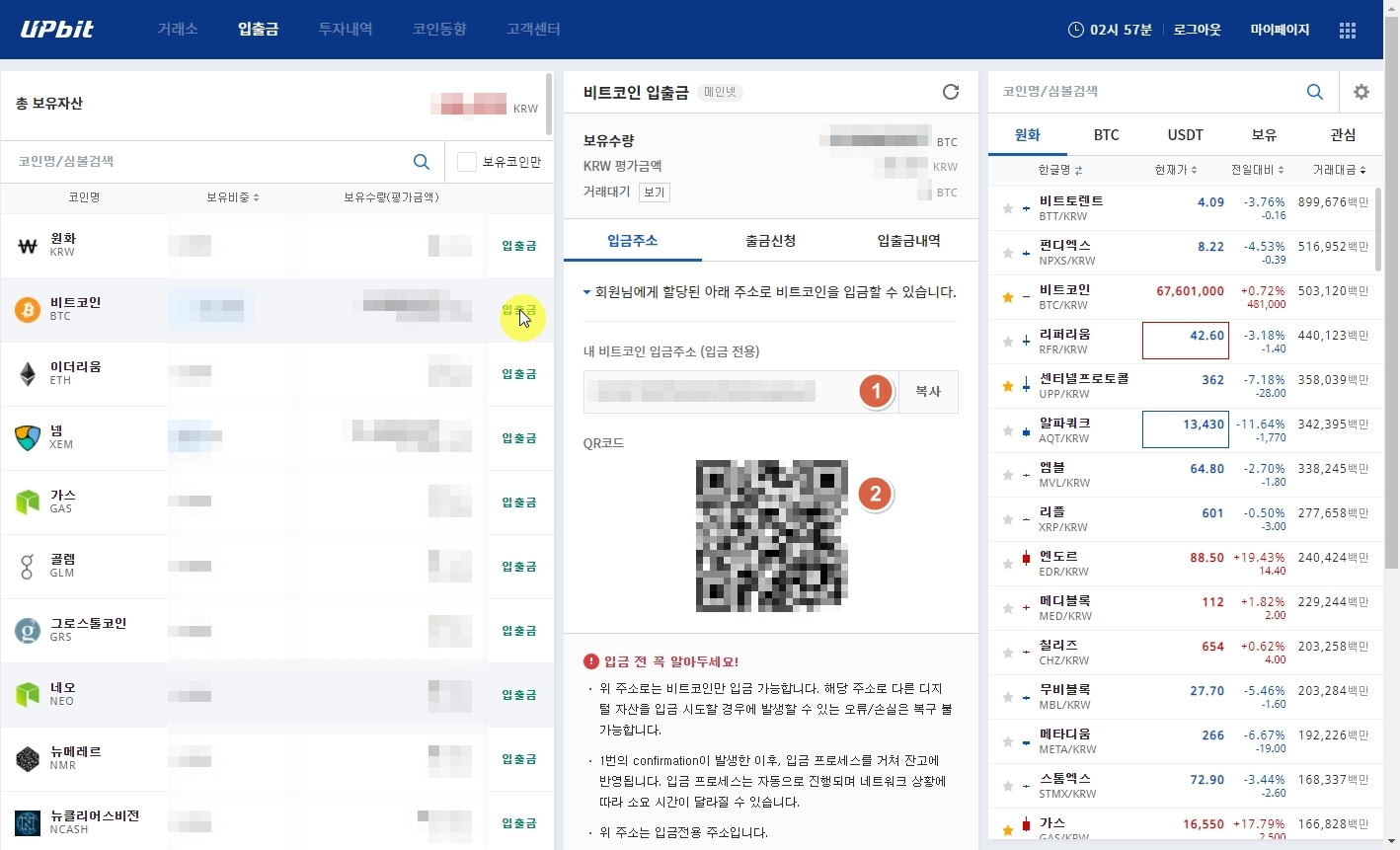 이제 비트코인 입금 주소를 받기 위해 업비트에 접속하였습니다. 비트코인 입금 주소는 은행 계좌와 같은 개념이라고 보시면 됩니다. 이 주소는 고유의 것으로 복잡한 영문, 숫자 조합이므로 잃어버리는 일이 없게 주의하셔야 합니다.