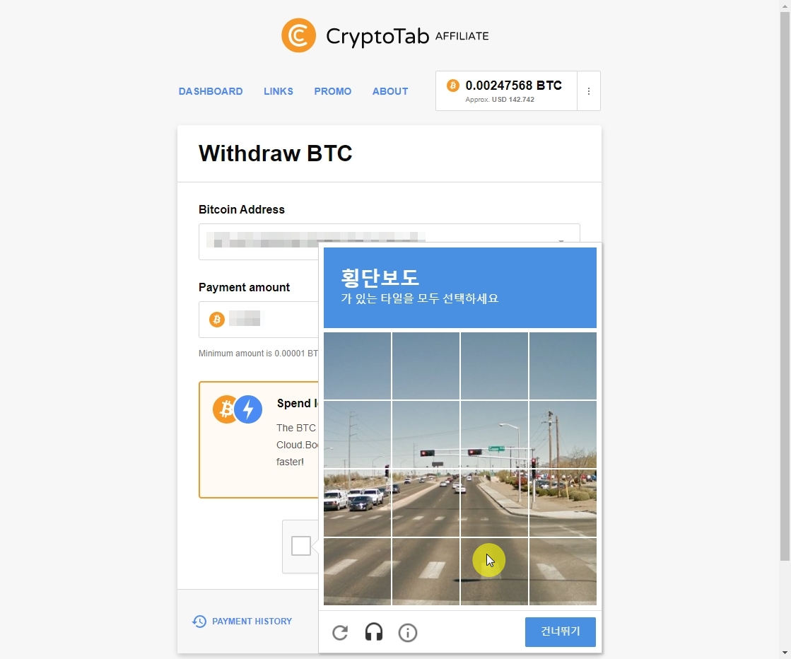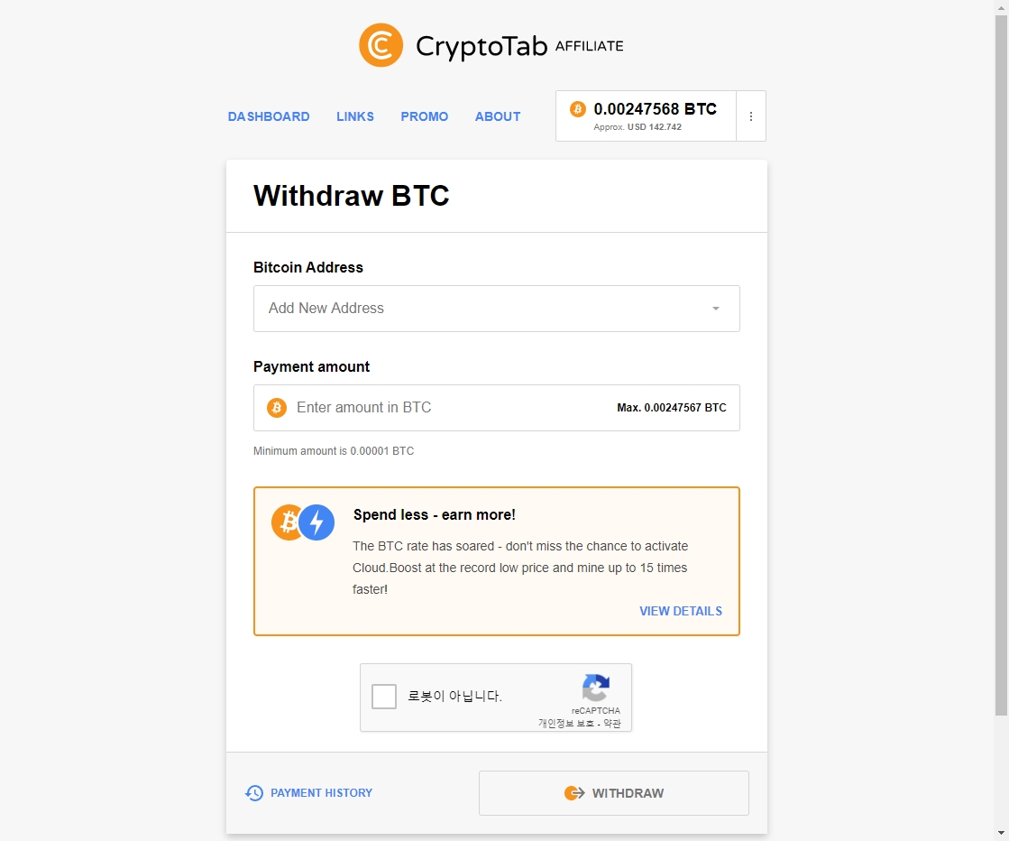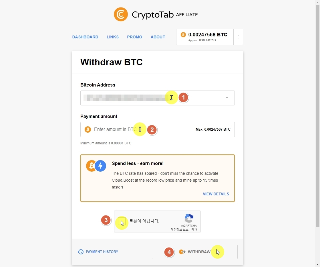 [CryptoTab] 크립토탭 비트코인 출금 신청하는 방법