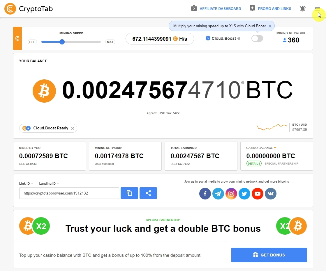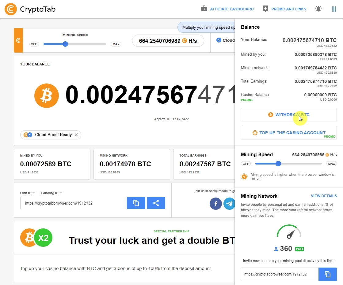 먼저 자신의 크립토탭 계정으로 접속하여 대시보드를 열어줍니다. 그러면 자신이 현재까지 모은 비트코인의 총액, 마이닝 네트워크 상의 협력자 수 등을 한 눈에 확인할 수 있습니다. 이제 출금을 위해 오른쪽 상단 三자 버튼을 눌러줍니다.