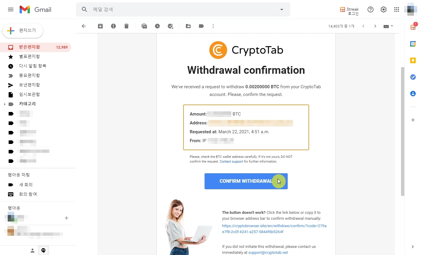 메일을 보면 위와 같이 크립토탭 출금 확인 요청 메일이 있습니다. 여기서 내용을 확인한 다음, 이상이 없다면 중간에 CONFIRM WITHDRAW 버튼을 눌러주시면 됩니다.