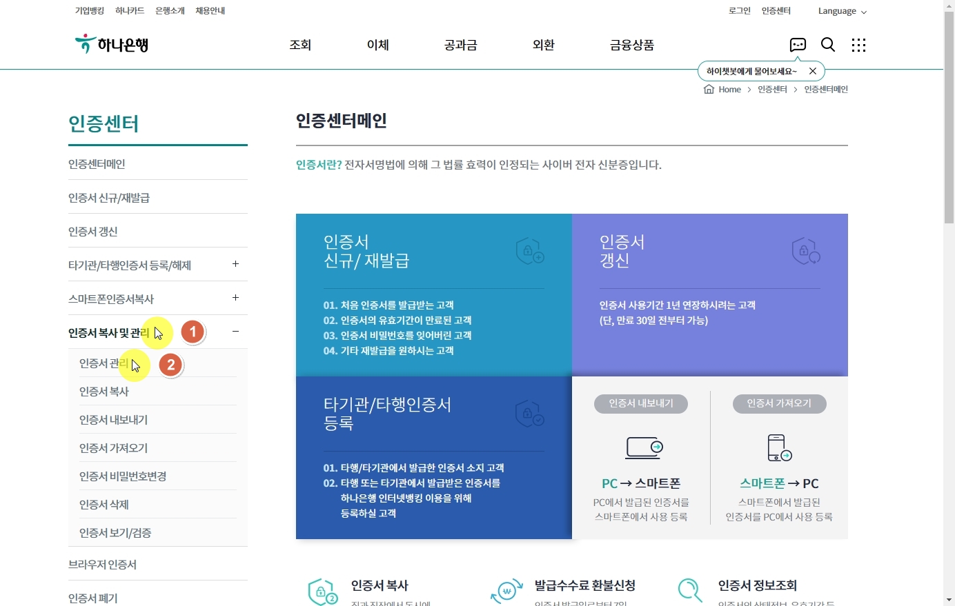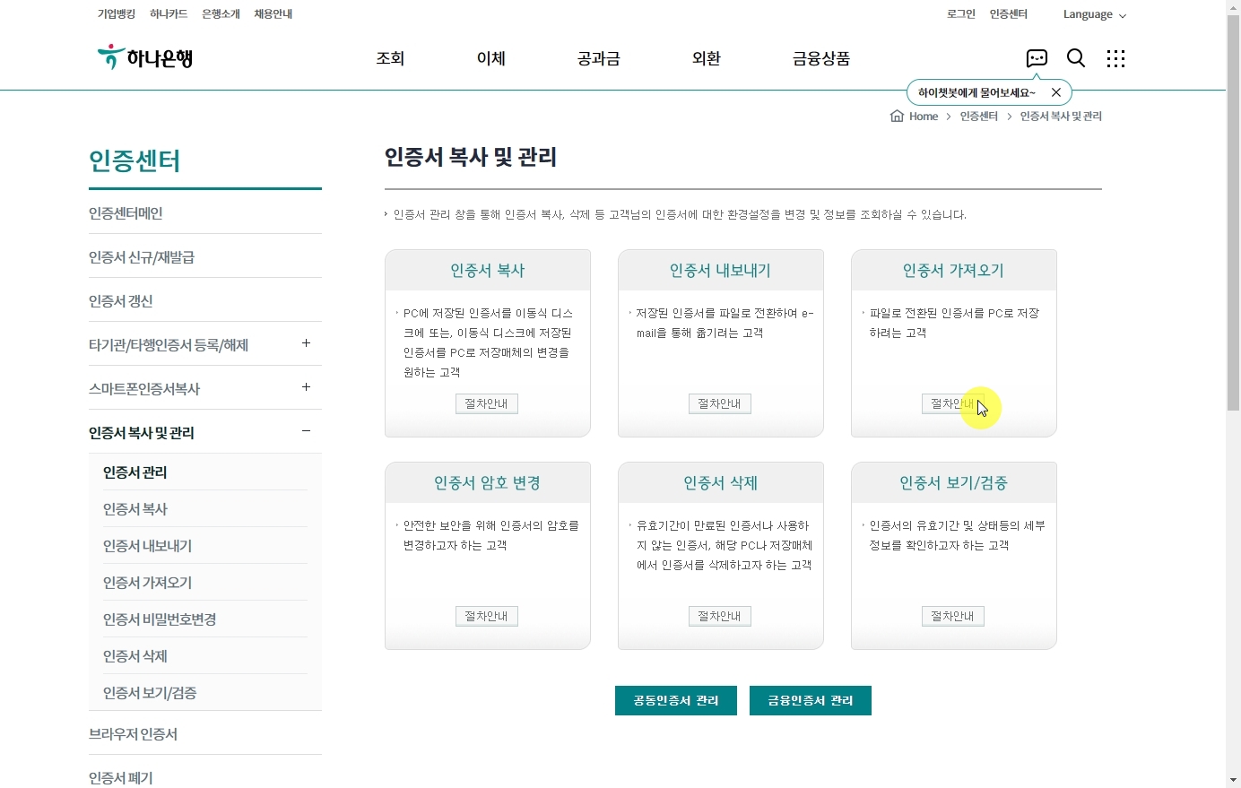 인증센터에 화면에서 인증서 복사 및 관리 - 인증서 관리 순으로 클릭합니다.