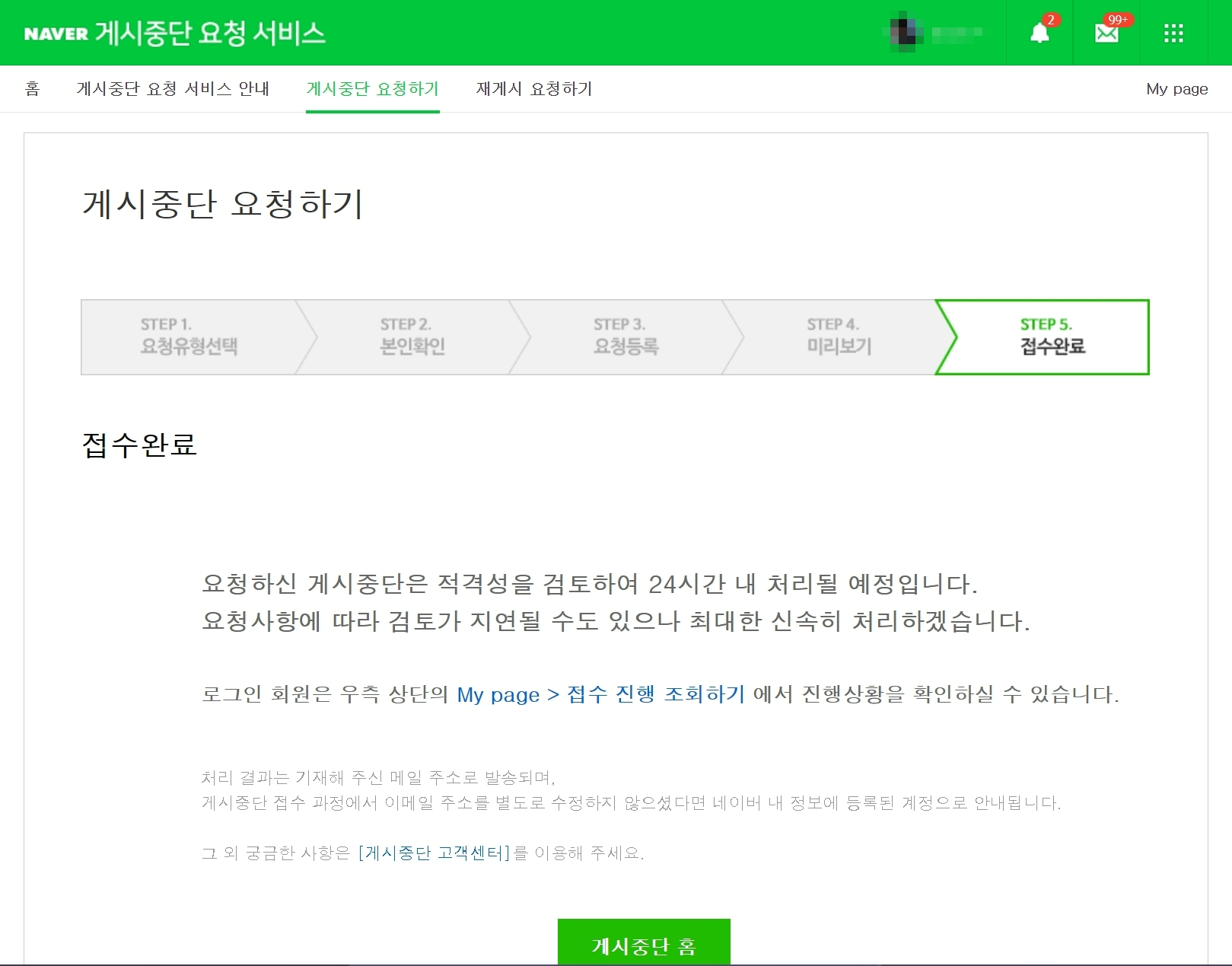 게시중단 요청하기 접수가 완료되었습니다. 요청한 게시중단은 적격성을 검토한 후 24시간 이내 연락해준다고 합니다. 하루 안에 결과를 확인할 수 있다고 하니 신고자 입장에서는 답답함을 덜 수 있어서 다행입니다.
