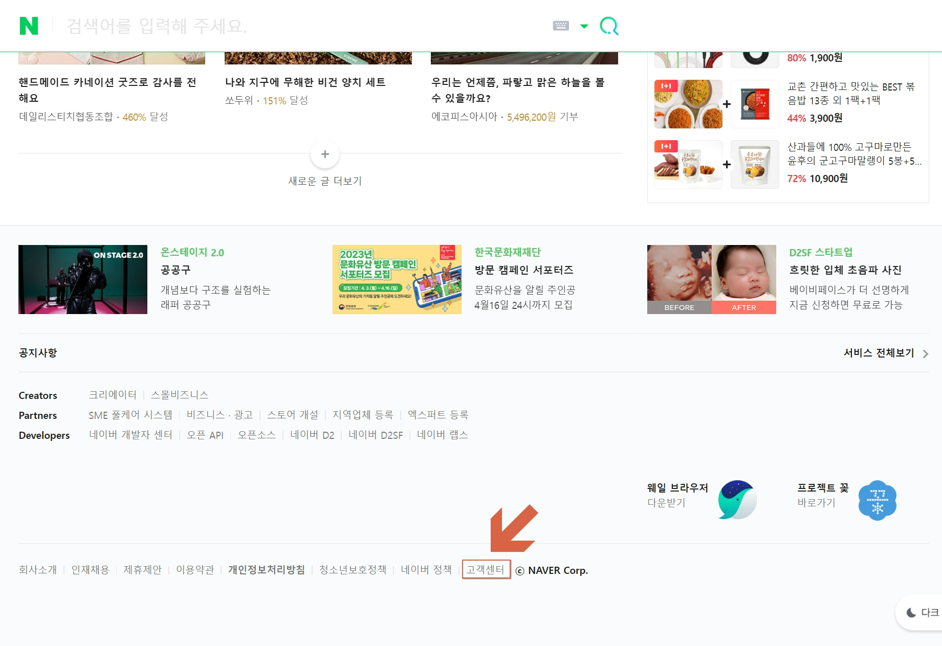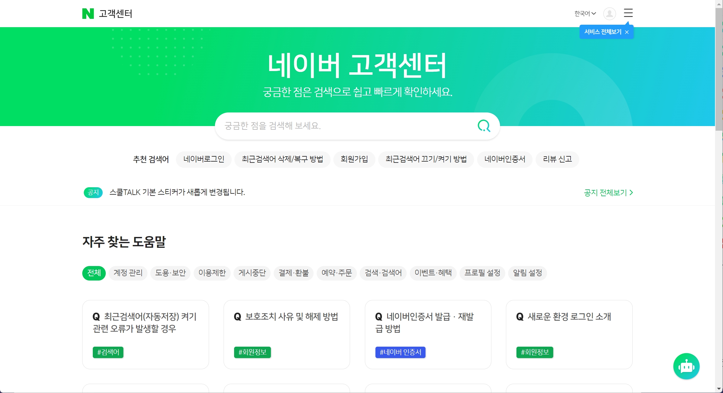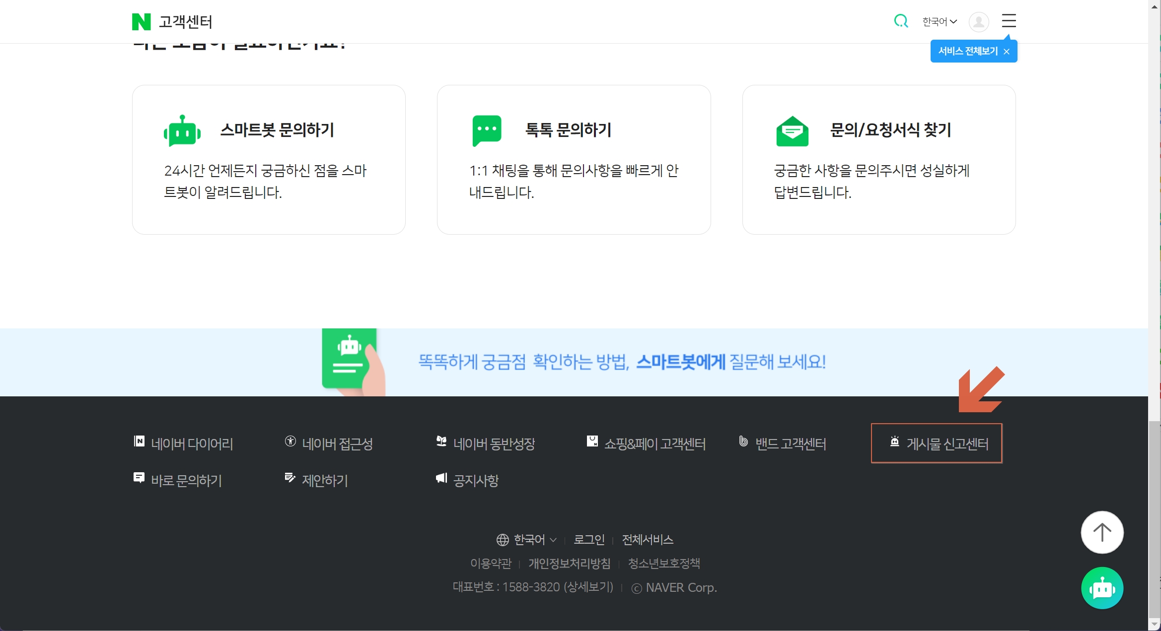 네이버 고객센터 화면에 접속하면 다시 가장 아래로 스크롤해줍니다.