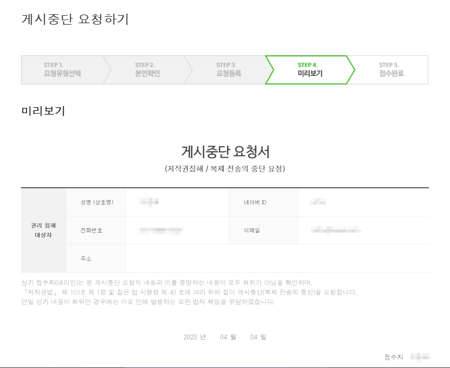 여기까지 작성이 되면 게시중단 요청서 미리보기 화면이 나타납니다. 내용을 확인하고 이상 없으면 다음 단계로 넘어가면 됩니다.
