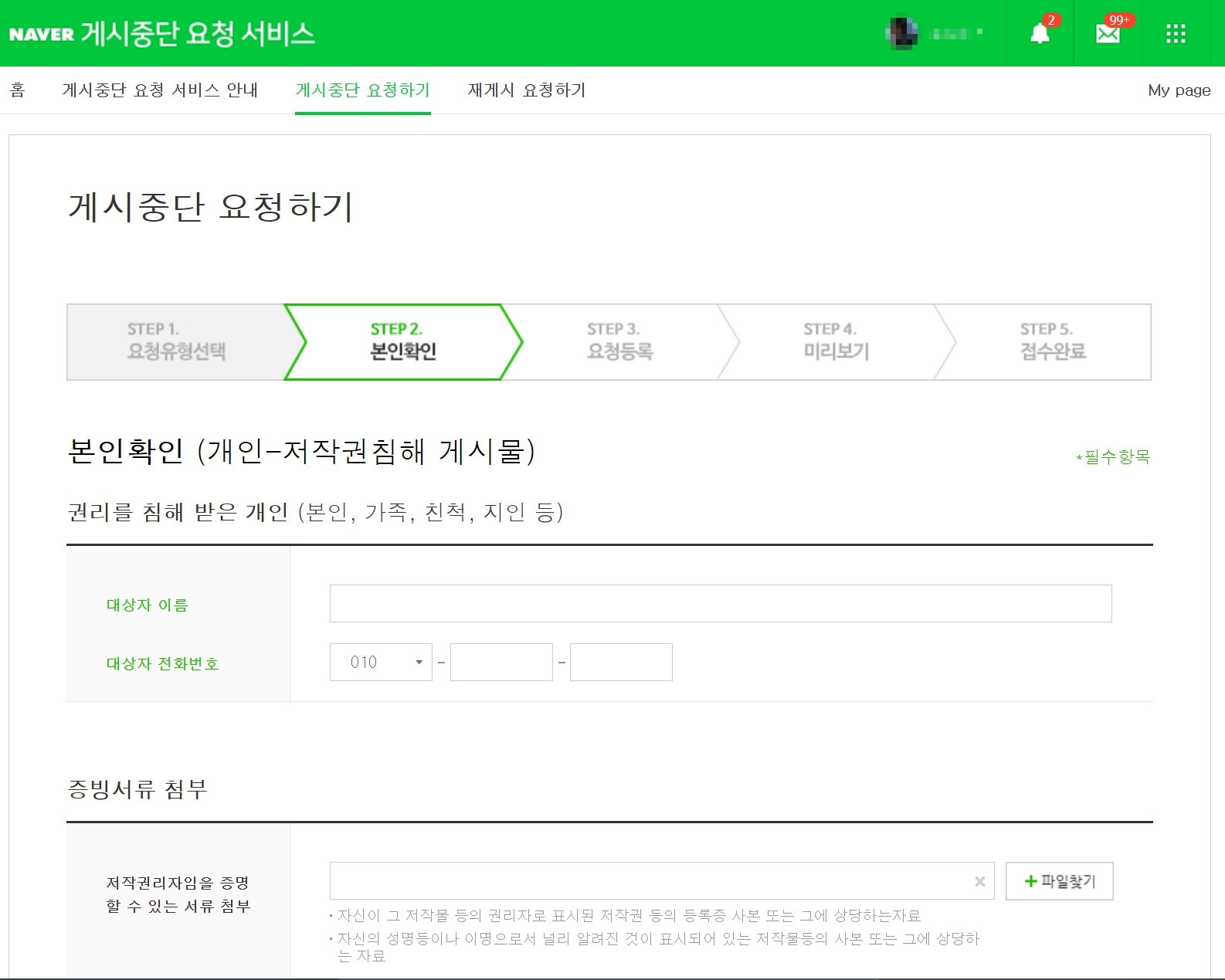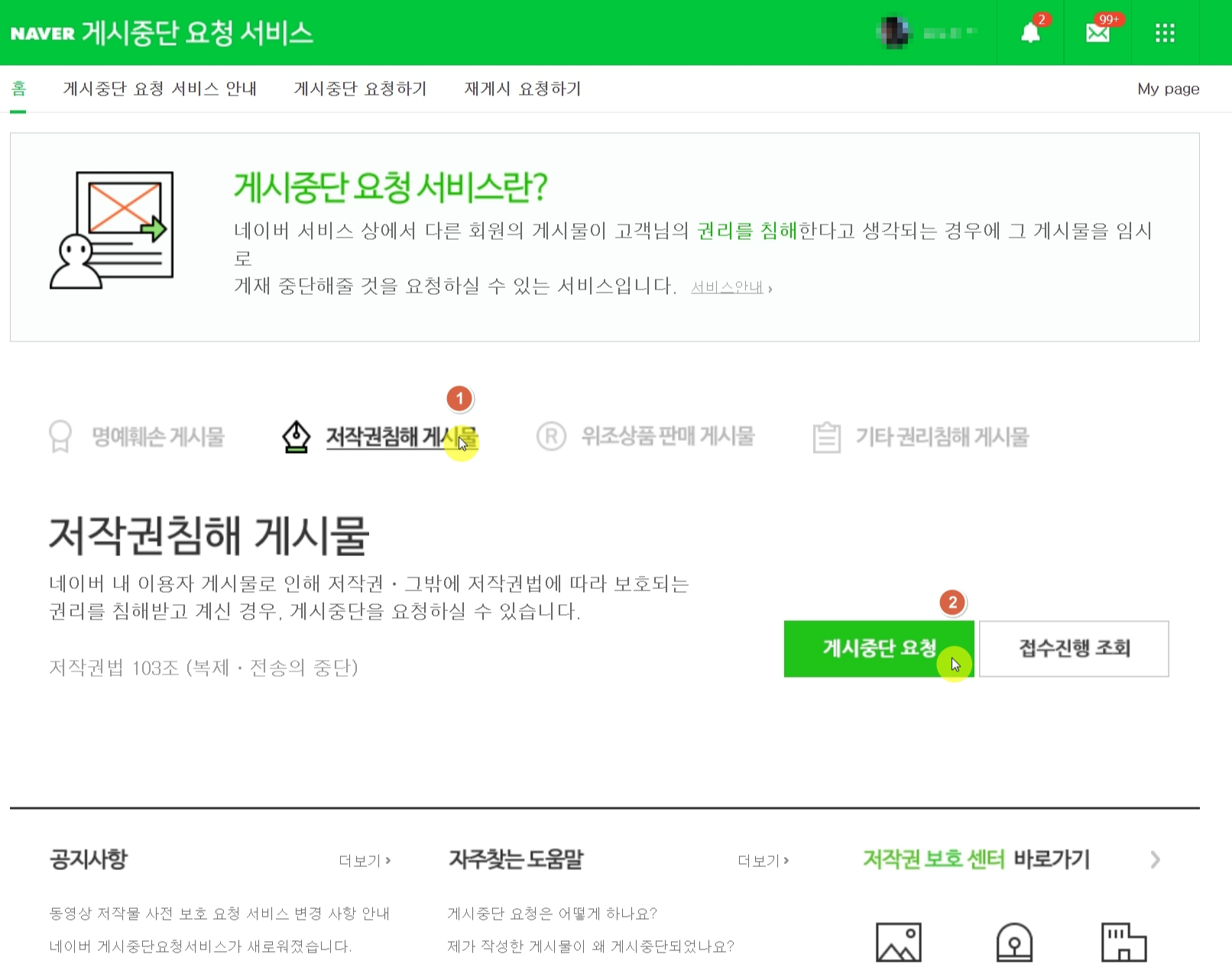 저작권침해 게시물 - 게시중단 요청 순으로 클릭합니다.