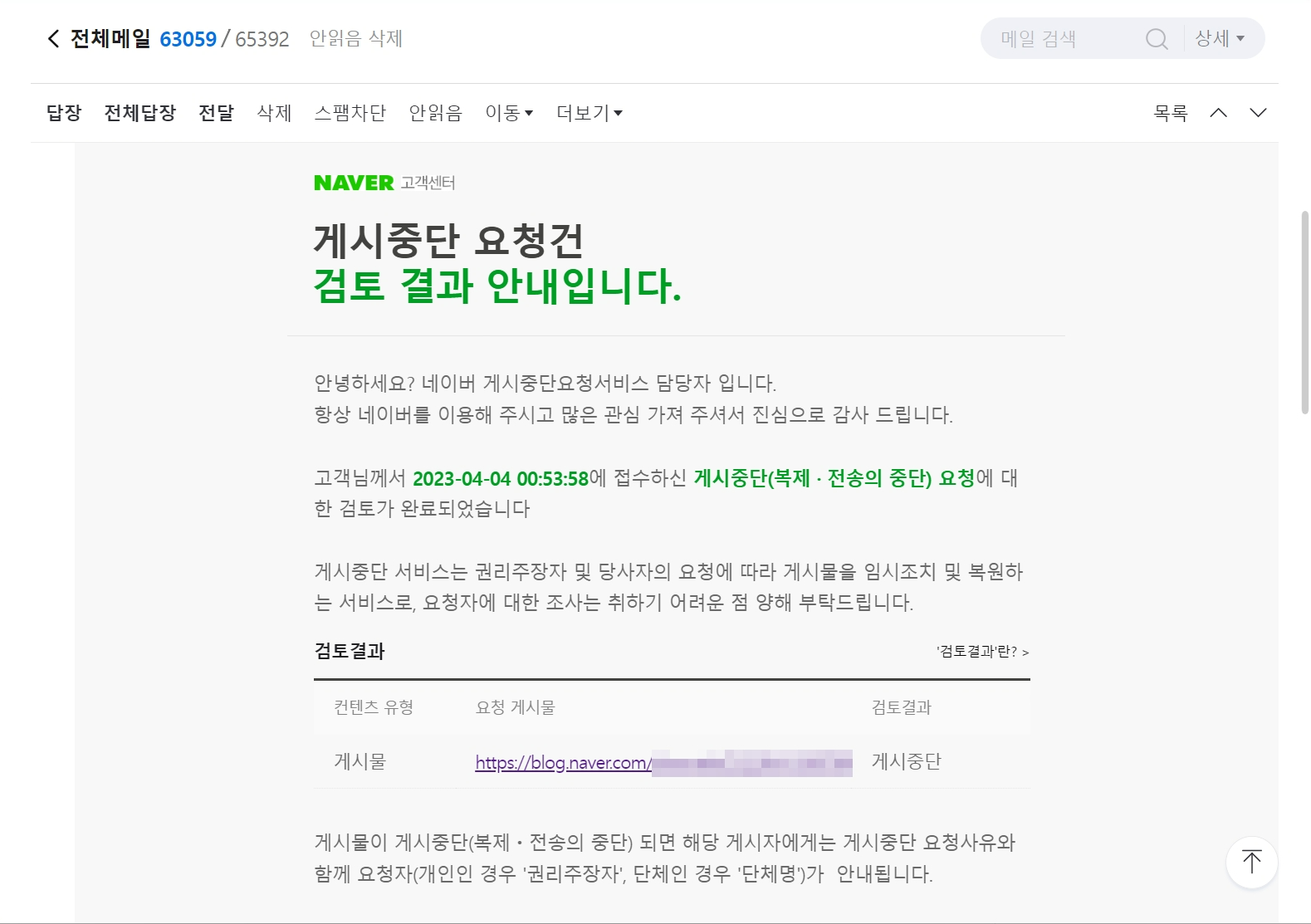 접수를 한 지 하루가 채 되지도 않아 네이버에서 게시중단 신고에 대한 결과가 도착했습니다.