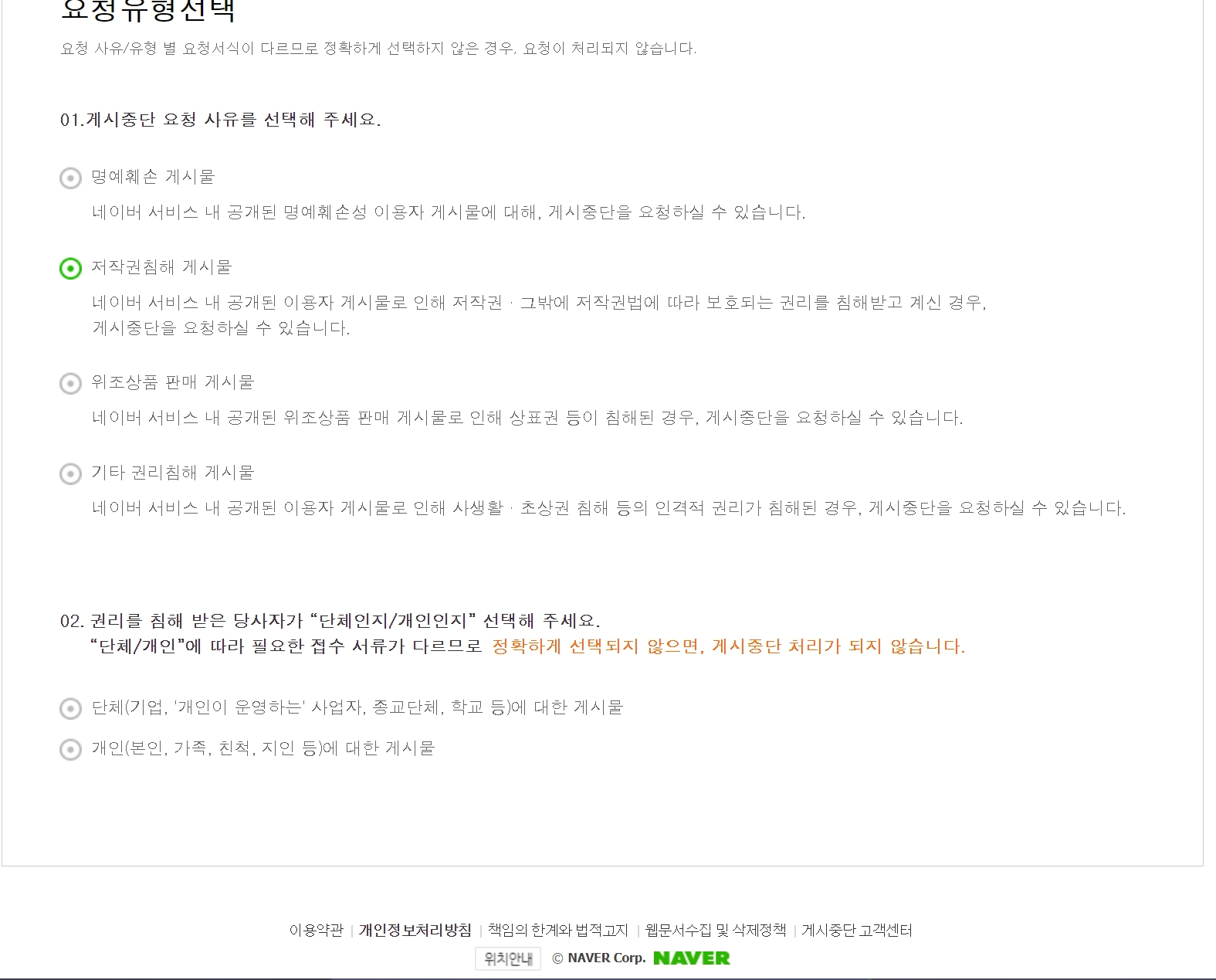 하단에서 권리를 침해 받은 당사자를 선택합니다. "단체인지/개인인지"에 따라 접수에 필요한 서류가 달라지므로 정확하게 선택해야 합니다. 제 경우는 티스토리 블로그에 있는 제 글을 가져온 것이므로 개인에 대한 게시물을 선택했습니다.