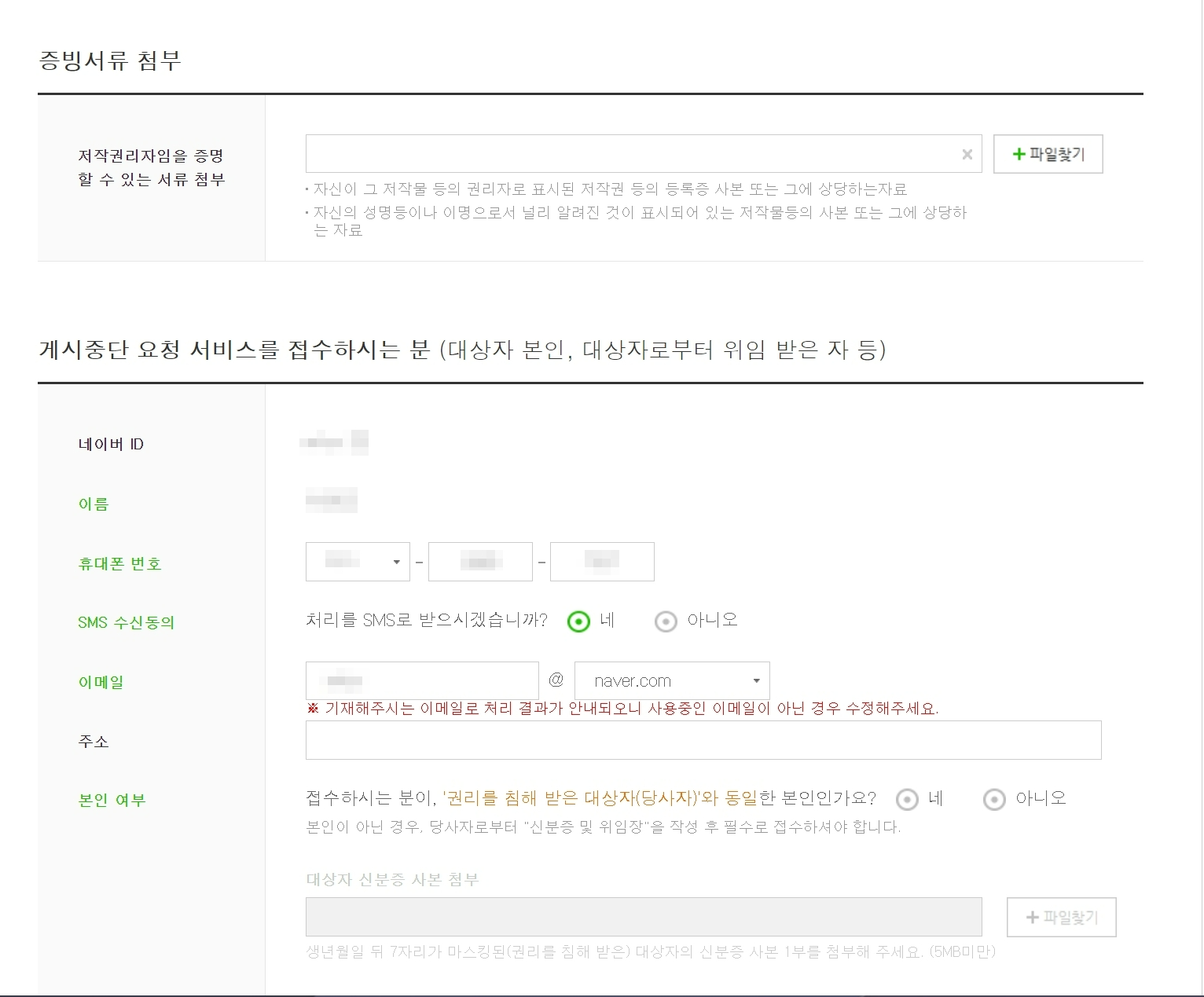 증빙서류 첨부 다음은 게시중단 요청 서비스를 접수하는 사람의 인적사항 입력 단계입니다. 저는 본인 접수이므로 이름, 휴대폰 번호를 확인하여 처리 결과를 SMS로 받을지 선택한 다음, 이메일 주소를 확인했습니다. 거주지 주소의 경우 필수 입력이 아니므로 입력하지 않으셔도 됩니다. 마지막으로 본인 여부 확인이 있는데 앞서 휴대폰 인증을 했기 때문에 패스했습니다.