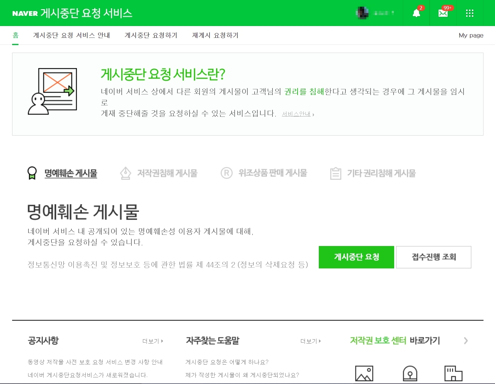 게시중단 요청 서비스 페이지가 나타납니다. 게시중단 요청은 명예훼손, 저작권침해, 위조상품 판매, 기타 권리침해 게시물에 대해 신고하는 서비스입니다.