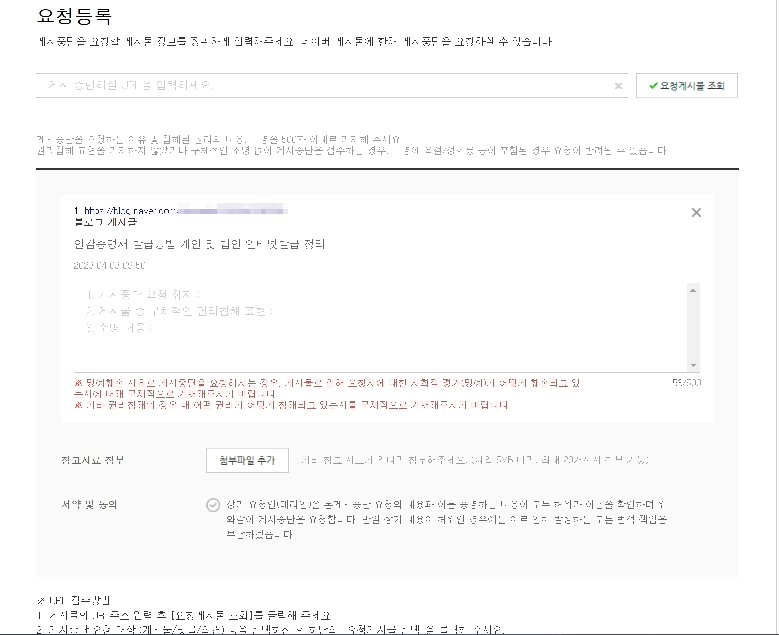 이렇게 세 가지를 최대한 자세히 써준 다음 하단에 참고자료 첨부를 해주시면 됩니다. 첨부자료는 제 블로그 에서 도용당한 사진을 다시 활용했습니다. 마지막으로 서약 및 동의 내용을 확인하면 됩니다.