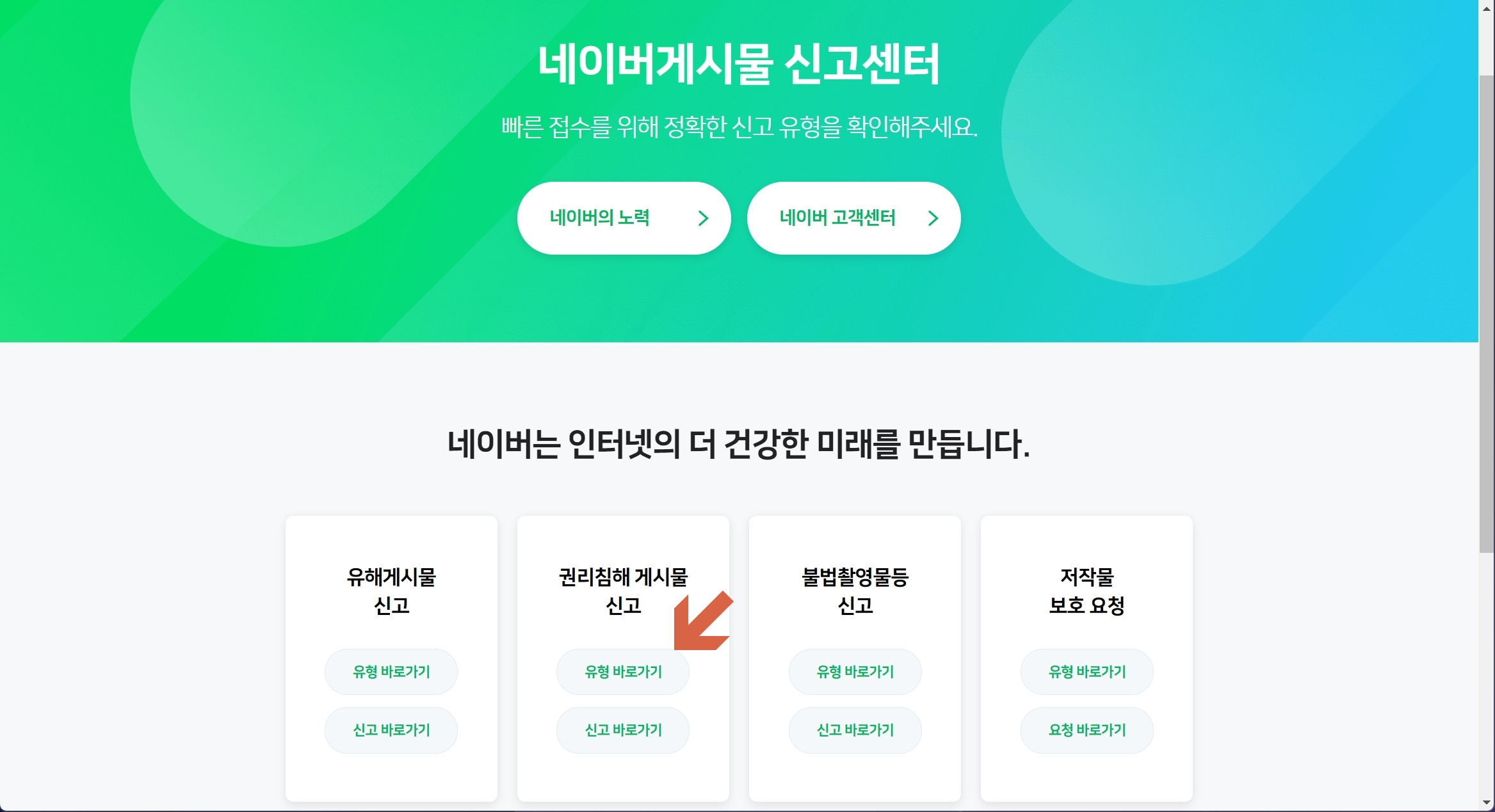 드디어 네이버게시물 신고센터에 접속했습니다. 이 곳에서는 게시물을 유해, 권리침해, 불법촬영, 저작물 총 4가지의 유형으로 나눠서 신고하도록 되어 있습니다. 고객센터 통화 당시 문의한 결과 저 같은 경우에는 권리침해 게시물로 신고하면 된다고 했습니다. 만약 구분이 애매한 경우 우선 신고부터 하시기 바랍니다. 이제 유형 바로가기 버튼을 클릭하여 다음 단계로 넘어갑니다.