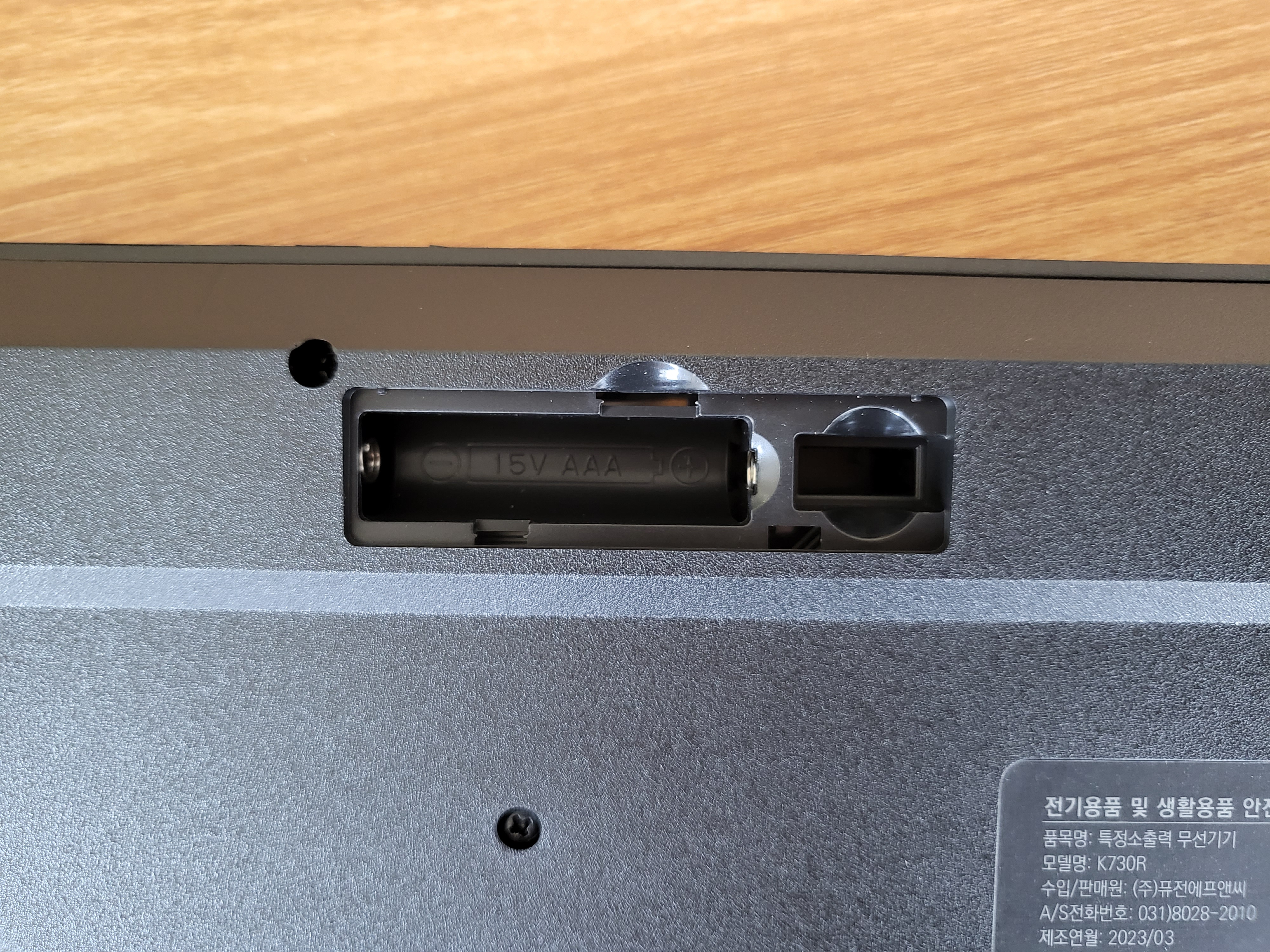 키보드 후면 상단에는 배터리 투입구가 있습니다. AAA 사이즈 배터리 1개가 들어가며 배터리 투입구 옆에 리시버 보관 홈이 같이 있는 것이 특징입니다. 저런 부분을 만들려면 금형 설계에서 비용이 또 들어갈텐데 사용자를 배려하여 키보드 또는 마우스를 따로 사용하더라도 보관할 수 있게 한 것인지, 아니면 다른 이유가 있는 것인지는 알 길이 없습니다.