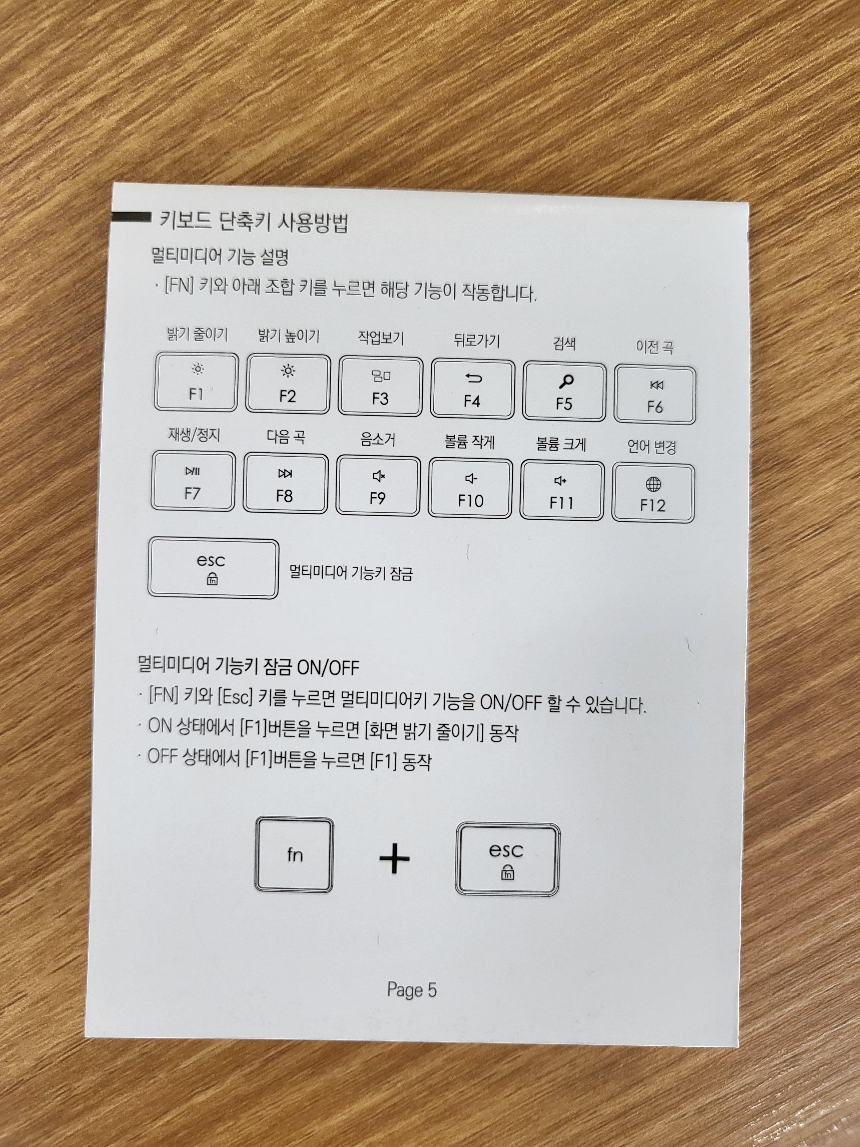 이 제품의 사용설명서를 다 읽지 않을 분들을 위해 가장 중요한 부분만 따로 보여드리려고 합니다. 바로 멀티미디어 키에 대한 내용입니다. 왼쪽 Ctrl과 win 키 사이에 있는 fn 키와 F1 ~ F12를 조합하면 다양한 기능키로 사용이 가능합니다. 또한 fn 키와 esc 키를 누르면 멀티미디어 기능키 잠금 기능을 켜거나 끌 수 있는데 켜짐 상태에서는 기능키(화면 밝기, 소리 조절 등)이 우선으로 작동하고 꺼짐 상태에서는 F키가 우선으로 작동합니다. 한마디로 켜짐은 맥 방식, 꺼짐은 윈도우 방식이라고 생각하시면 됩니다.